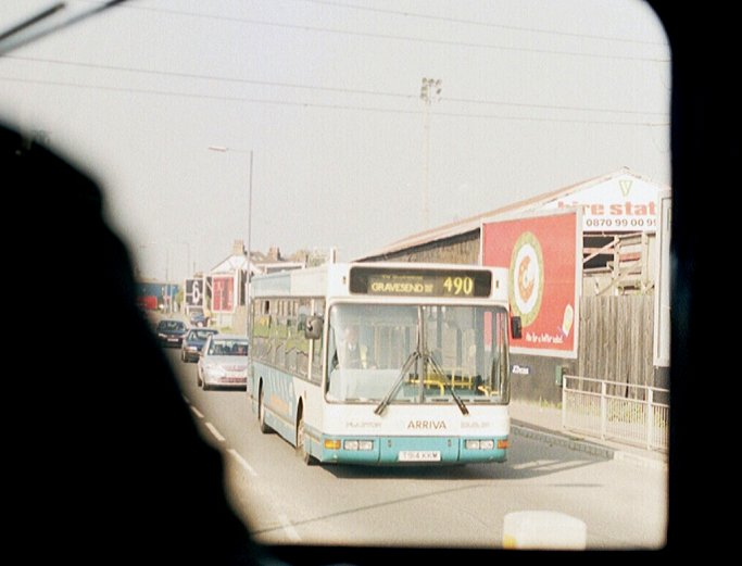 We climbed up East Hill again to escape from Dartford, and rumbled on along through Horns Cross, passing another red bus coming back from the shopping pit, an Arriva DAF/Wright on the 492 to Sidcup Station. Further on we passed RF600, heading west past Swanscombe on another 725 working.