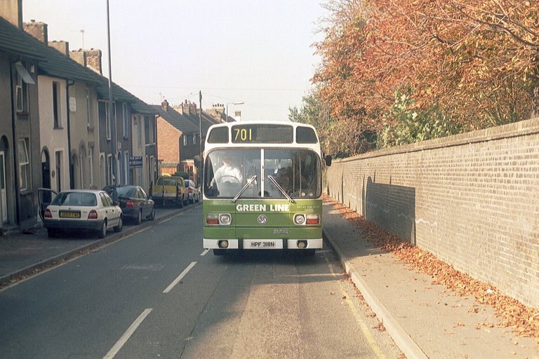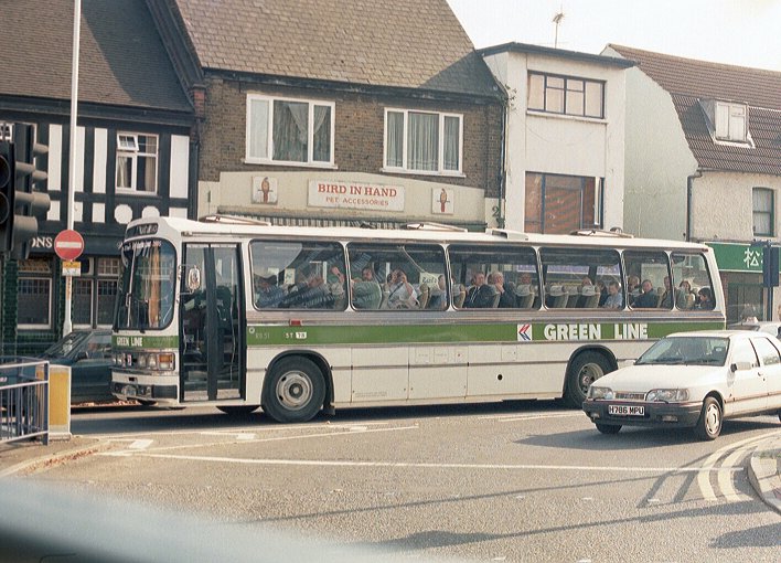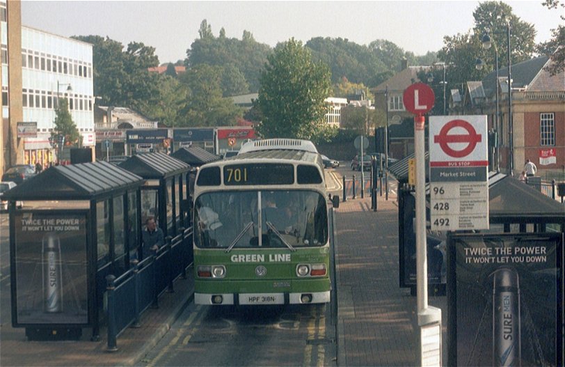 A later, less luxurious and rather more spartan breed of Greenline coach roared past, to stop at the bus station. It was Leyland National SNC168, also working a Gravesend-Dartford 701. We set off round the large one-way traffic loop to Dartford Station, where we paused again, in company with Stagecoach Trident 17867 on the 96, a reminder that trolleybuses used to reach Dartford - solidly Country Area - on the 696.