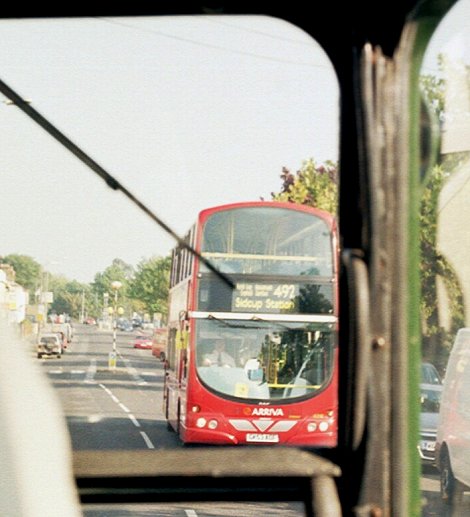 Time was pressing on, so we reboarded, and headed back for Gravesend. We passed another of Arriva's DAF/Wright buses on the 492: 6218. Up on the hill near Northfleet Garage we noted that the low sun was throwing long shadows across the road. But careful selection of a bus-stop layby, and careful positioning of the bus between two such shadows gave us the sunny shot we wanted! As we went to reboard RT3148 the bustling shape of RF48 appeared, working a 702 to Swanscombe.