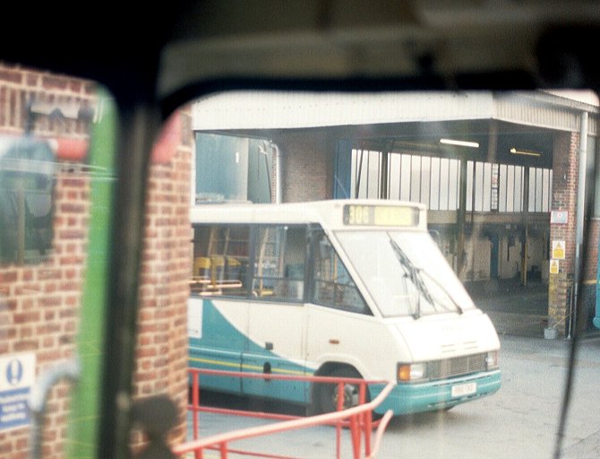 We turned in to the garage. We would not be allowed to stop. We descended the slope, and Eddie piroetted the tiny Bristol in the yard, outside the shed doors (still in LT blue). I snapped away in the half-light at everythiing that passed in front of the windscreen. Well, almost everything - this camera doesn't have a motor-wind! Buses in sight included MetroRider 1810, Northern Counties Darts 3133 and 3143, Volvo B6s V203 and V204, East Lancs Dart YDT505, as well as newer types.