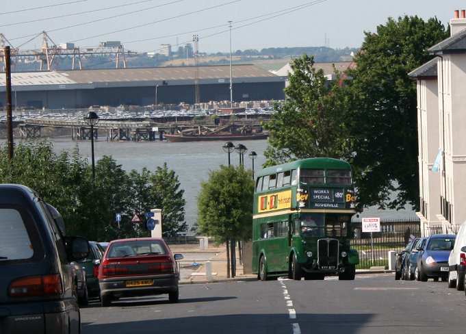 We headed east up the hill into Denton, to turn at the roundabout. Then it was back into town, and round past a curiously deserted Railway Station to get onto the Overcliffe. The 480A was a works service that only operated at certain times of day: clocking on time, clocking off time, and curiuosly, each way at lunch-time, when a clutch of RTs gathered outside the Rosherville works to collect the workers, whisk them home for their dinners, then bring them back for the afternoon shift. So just short of Northfleet Garage we turned right, and descended to the side of the Thames, where it still possible to turn the bus and back it up against the wall as used to happen.