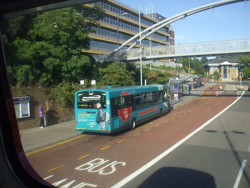 On the north side we negotiated the tangled wilderness: a tangle of power lines, railway lines, High Speed One, motorways and industry. We rounded a roundabout and headed in to the Lakeside shopping pit, the north-side equivalent of Bluewater. We visited the bus station, then headed out for Grays. East Thames EnviroDart 36042 balanced us round the Lakeside roundabout, and we headed east. There were other buses: Southend's Dart SLF 3278 headed past us towards Lakeside, and a red Arriva EnviroDart sneaked past too quickly for me to snap it.