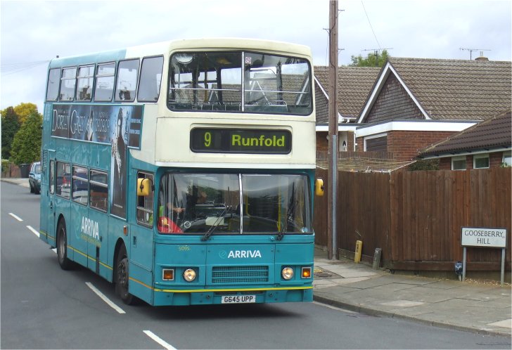 645-657: More AlexandersAnother batch of thirteen with Alexander RL bodies (including one, 654, with coach seating) was bought at the end of 1989. They have worked almost exclusively on Luton, Dunstable and Aylesbury services, but the integration with London Country North-West saw Luton buses appearing on the long-standing 321 route. 656 (by then 5106) was loaned to Wycombe to test its hill-climbing capability in comparison with the ex-Oxford buses during October 2002.They progressed from red and ivory livery to The Shires' blue and yellow. Renumbering saw them take 5095 - 5107. Slowly they acquired Arriva turquoise and cream, mainly as they progressed through Derby's refurbishment programme in the early years of the new Millenium. 5095 on Luton local service 9 on Saturday 5th September 2009.