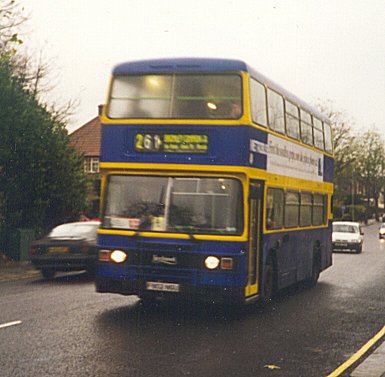 Lowheight all-Leyland Olympian 802 was on duty on London Transport route 261 on Friday 28th November 1997. Conditions near Grove Park, not long after dawn, and after rain, were fairly awful, and photographic logic said I couldn't take the picture of a moving bus but here is the snap-shot anyway.806 has been preserved in Metrobus livery, and may be seen operating at Running Days.