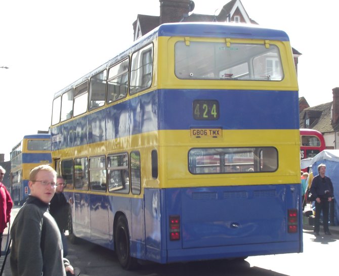 Preserved 806 on duty in East Grinstead on the 424, during the 2012 East Grinstead Running Day.Northumbrian Refugee from Kentish BusB248 NVN was a well-travelled bus. New in March 1985 to Northumbria, an ECW-bodied single-door bus, it came south to Kentish Bus in December 1990. Metrobus bought it in August 1998, numbering it 348. For a long time it wore an overall advert for Mercury Radio, eventually being repainted to Metrobus livery in mid-2000. It too settled down as part of the Country fleet, at South Godstone and Crawley, being renumbered 898 into the non-lowfloor doubledecker sequence in August 2001.