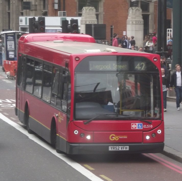 For years the only place I saw ELS buses was on the 42 at Liverpool Street. Perhaps that is not so surprising, really. This is April 2014, during the RT75 celebrations.Odd appearances on other routes continued. While the WHYs on route 360 were being rebuilt ELSs were used fairly often, alongside elderly LDPs. The ELSs had their tip-up seats removed in spring 2011, reducing their seating capacity to 29.Route 42, with all fourteen ELSs, was re-allocated to the other Mandela Way garage (MW) in October 2012. They retained the Q garage codes. The Scanias were proving less than totally reliable by this time, so route 42 saw a wide variety of substitutes, both single and double-deck. They went back to Camberwell at the end of September 2014, with the contract extended for another two years. But in December the fuel-thirsty Scanias began to be displaced by SOEs from Merton, with sales to Ensign Bus and on to Trustybus at Roydon. The other four became training buses They had the front display covered with a vinyl wrap showing an L-plate and "DRIVER UNDER INSTRUCTION". ELS5 seems to have been based at Bexleyheath, ELS6 at Northumberland Park.These four passed on to Go-Ahead East Anglia, two with Konectbus and two with Hedingham Omnibus.
