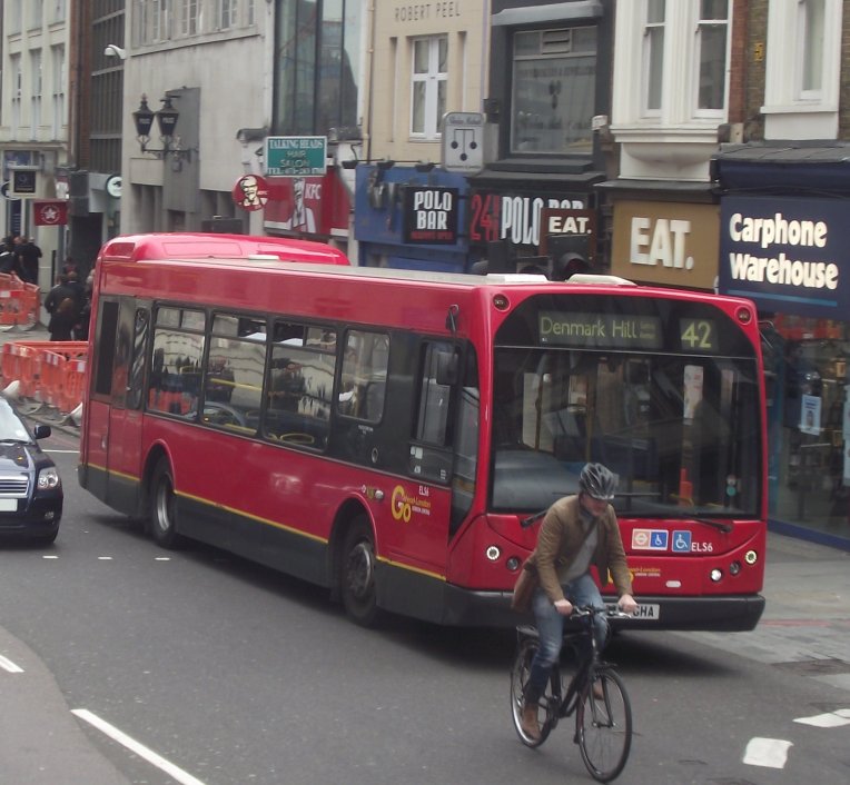 Go-Ahead London took over the operations, bases and buses of East Thames Buses on 3rd October 2009. The ELS class remained at Mandela Way for the 42, until May 2010, when this Mandela Way garage closed and the ELSs all moved to Camberwell, including ELS14 which had had a short stay at Bexleyheath. They were still with the 42. Repaints introduced Go-Ahead's charcoal skirts with yellow cheat-line, although some buses managed to escape repaint and retained all-red. They also gained duty-number holders on the sides and Q garage codes.
