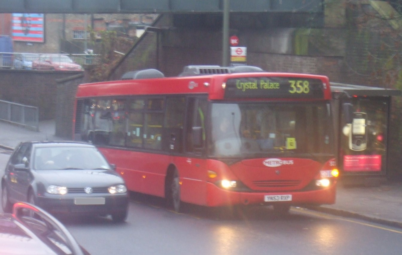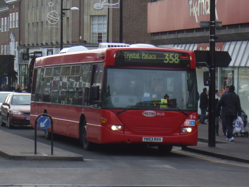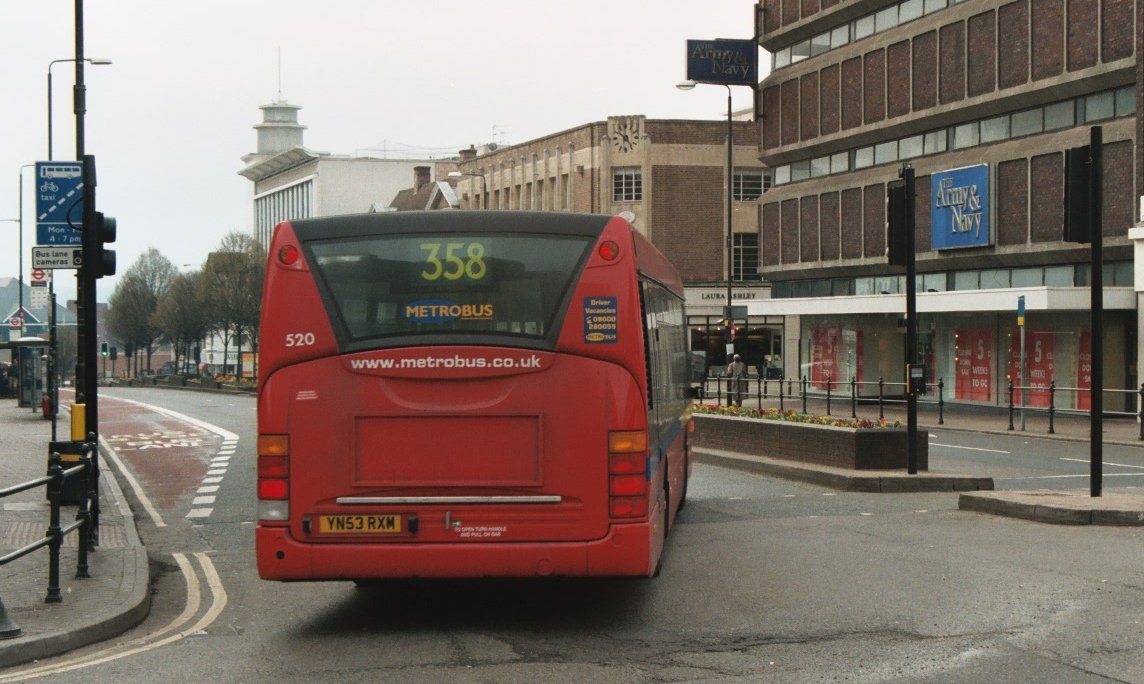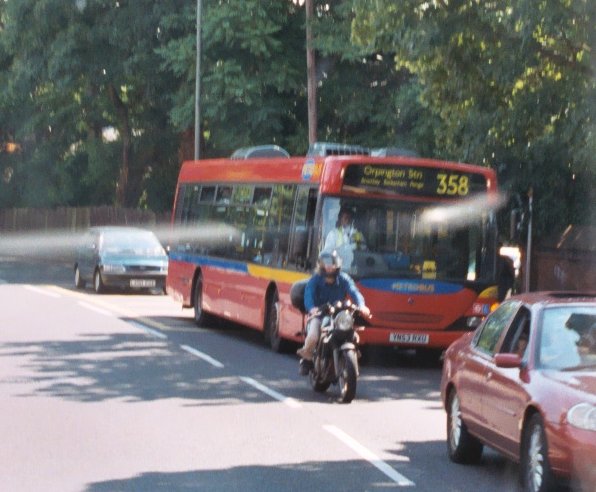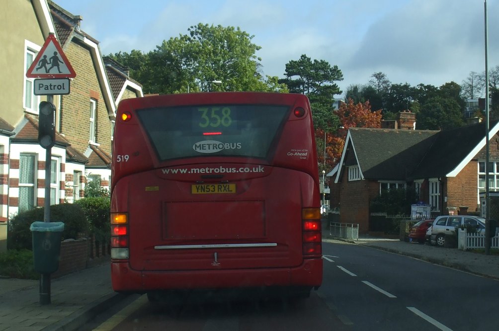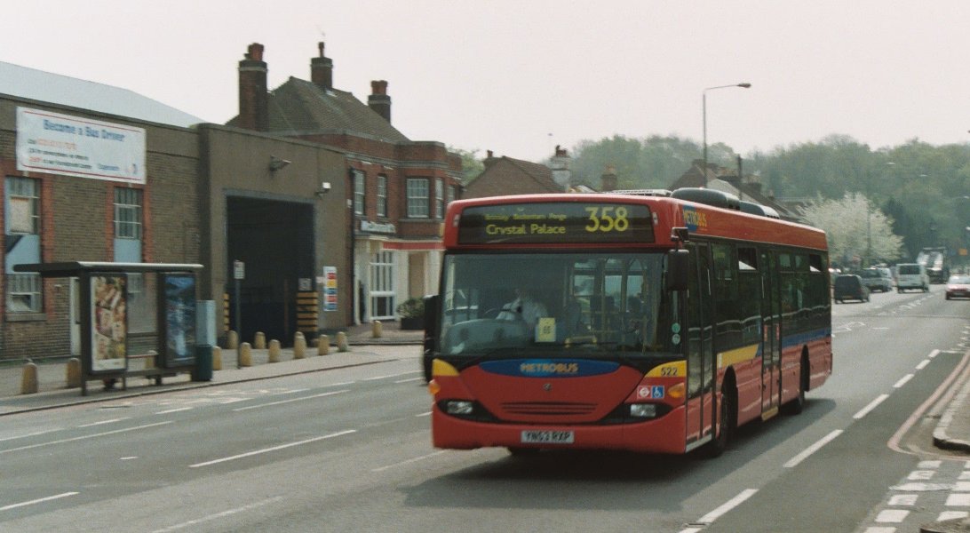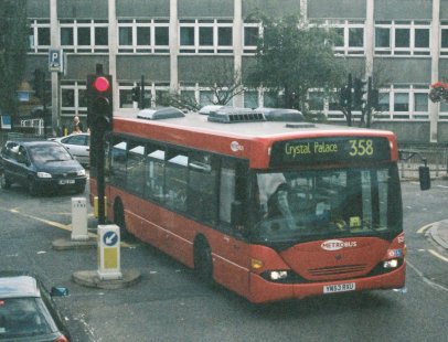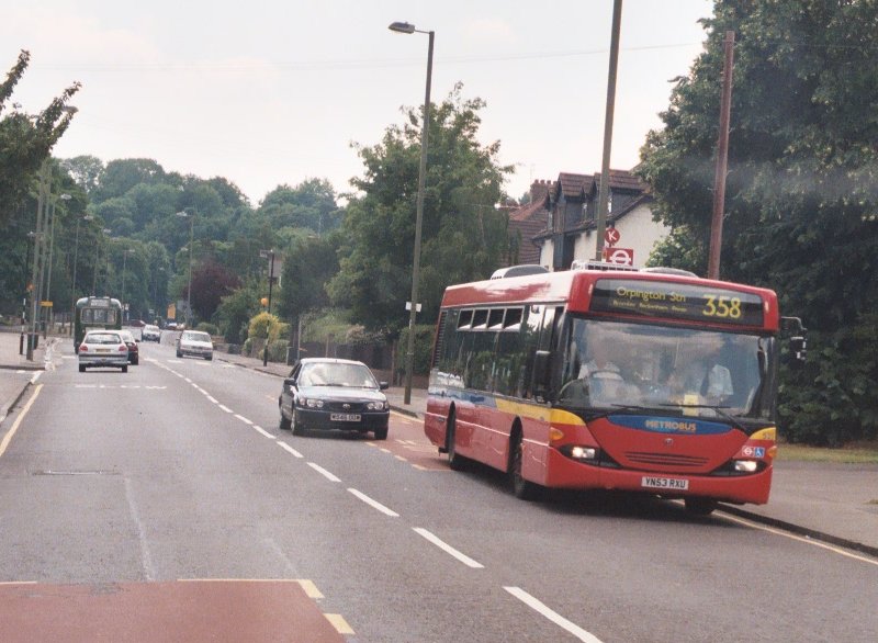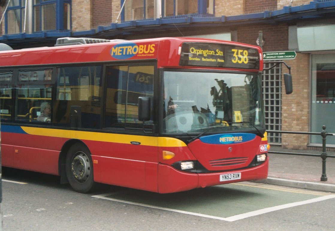 1/04 MB new to Metrobus for 358: red, narrow blue/yellow band (Green Street Green)