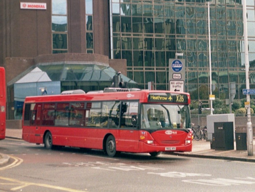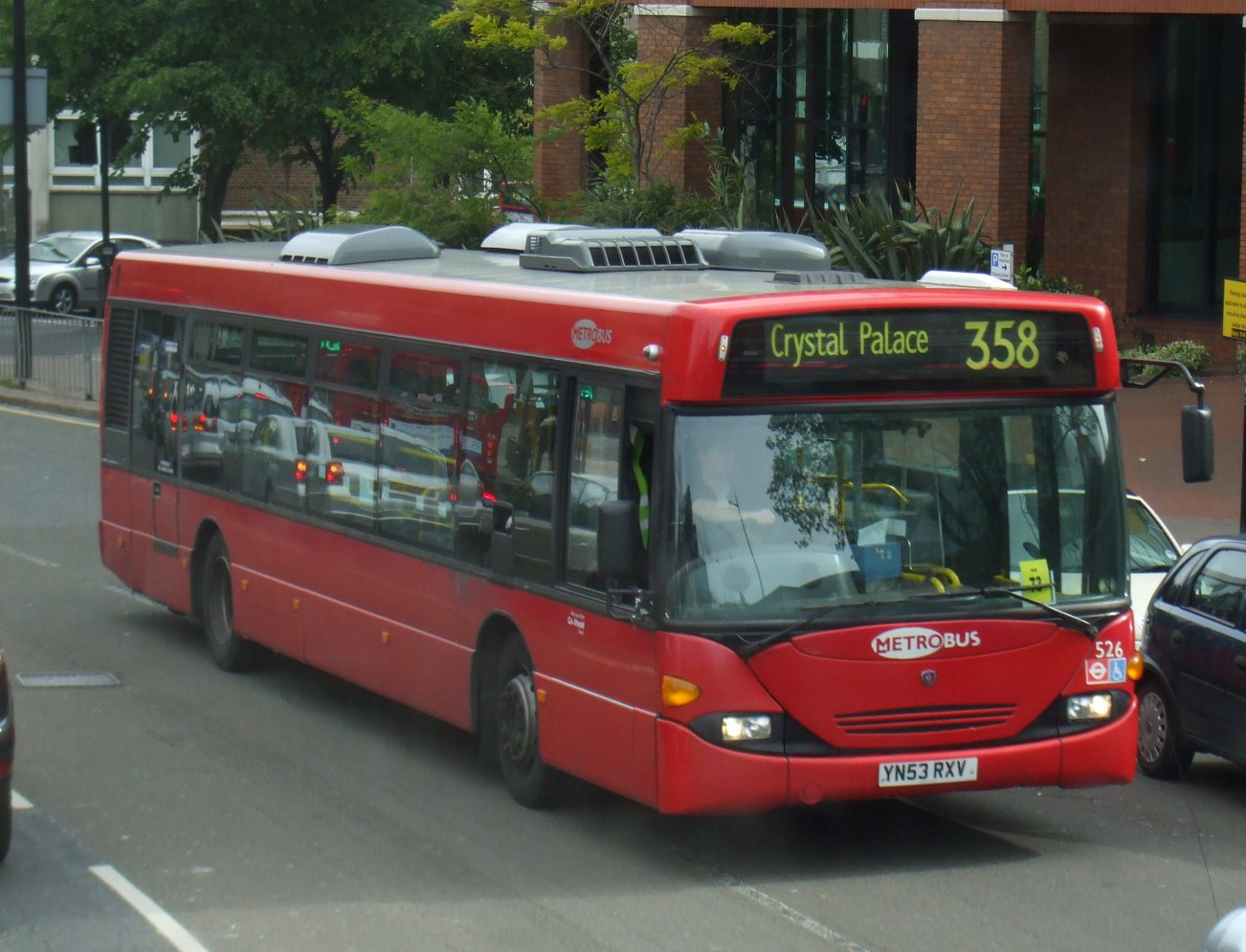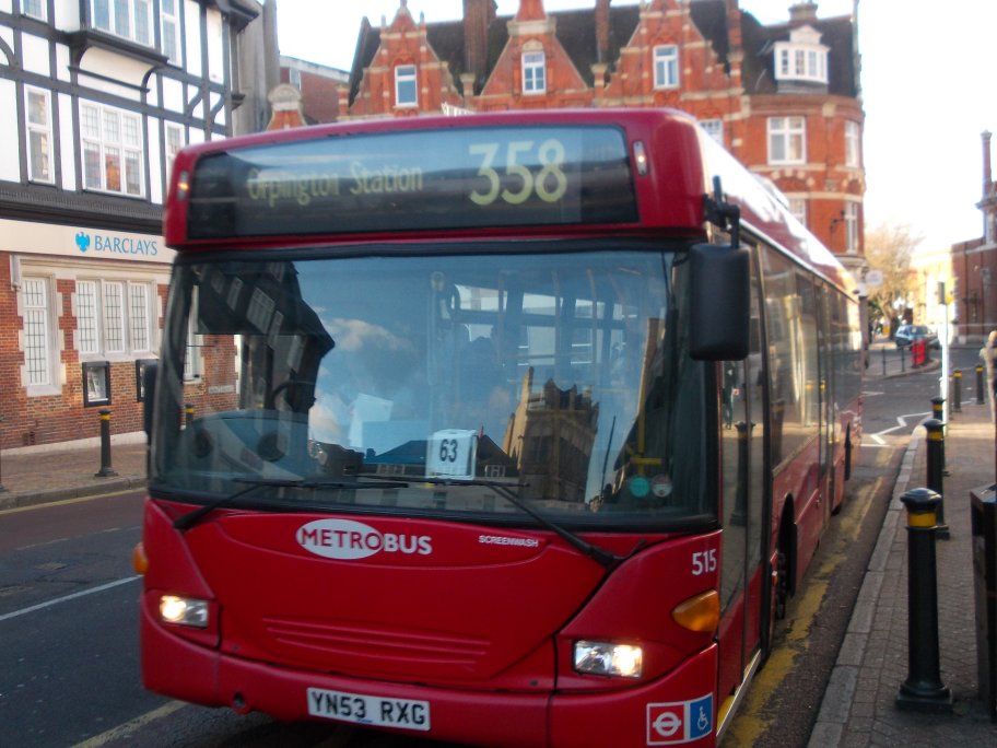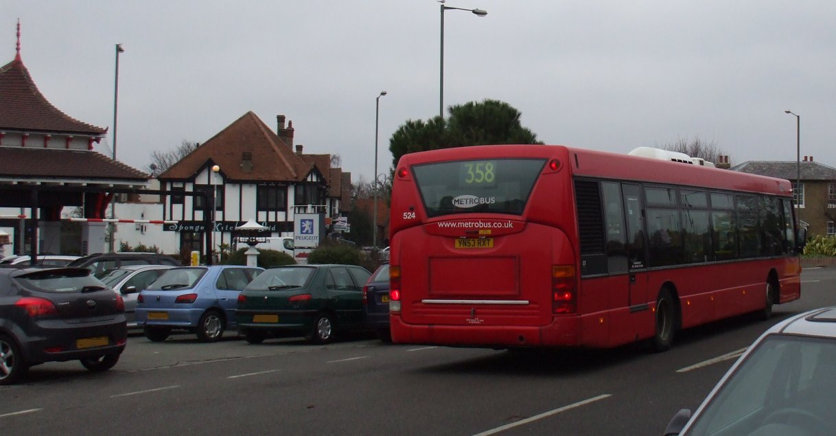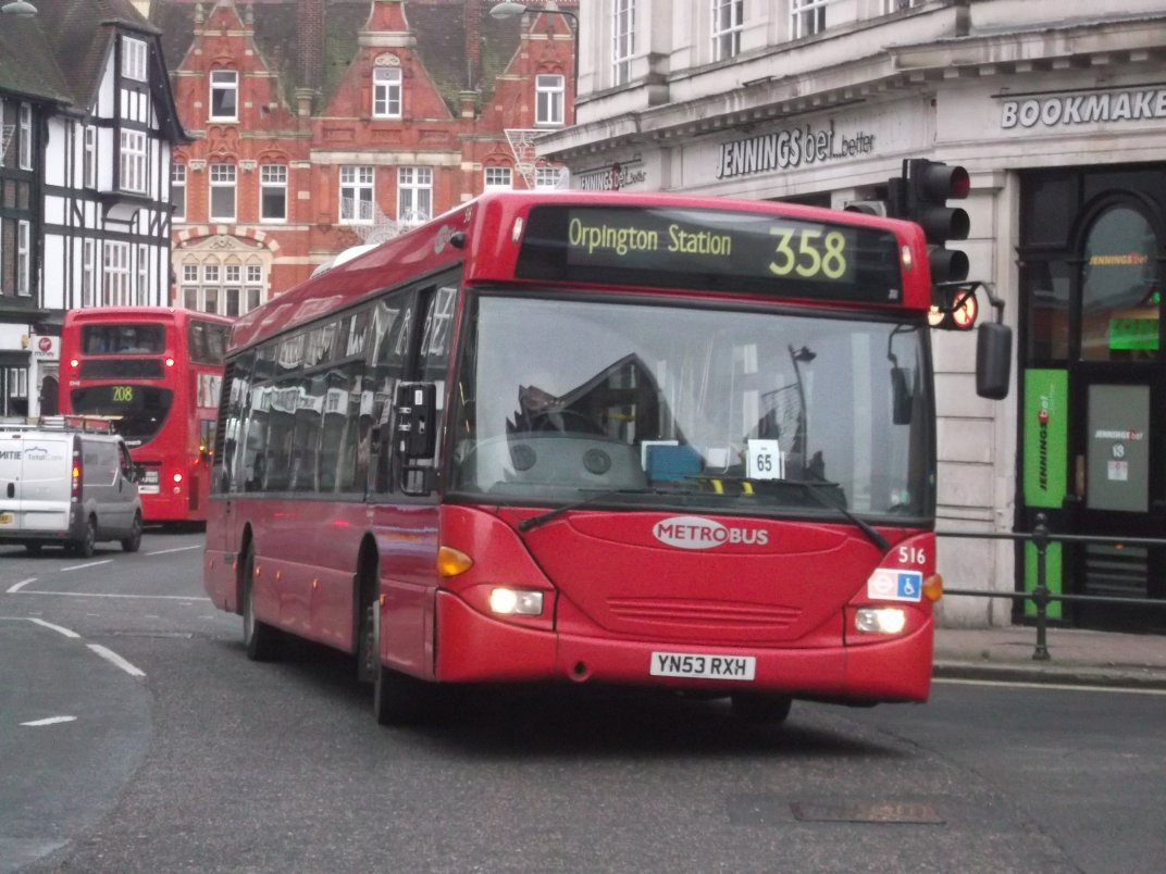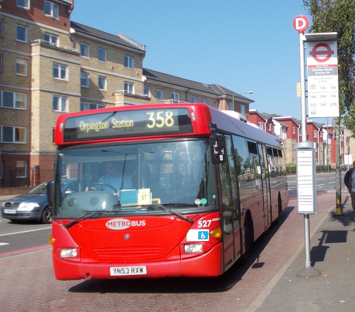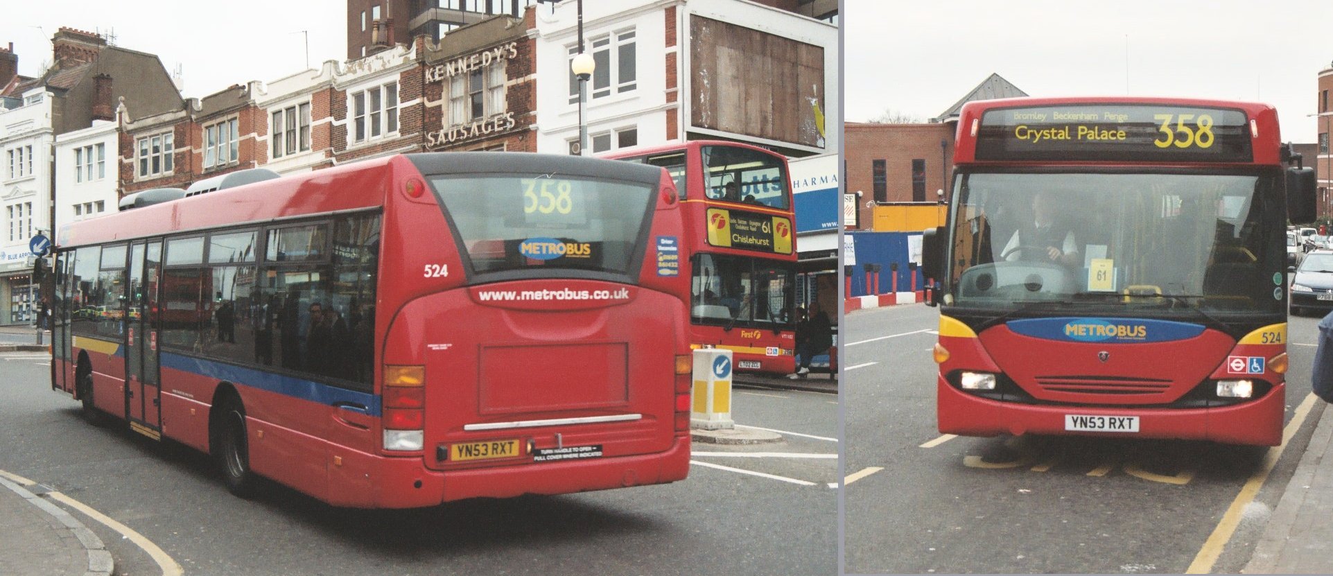 1/04 MB new to Metrobus for 358: red, narrow blue/yellow band (Green Street Green)