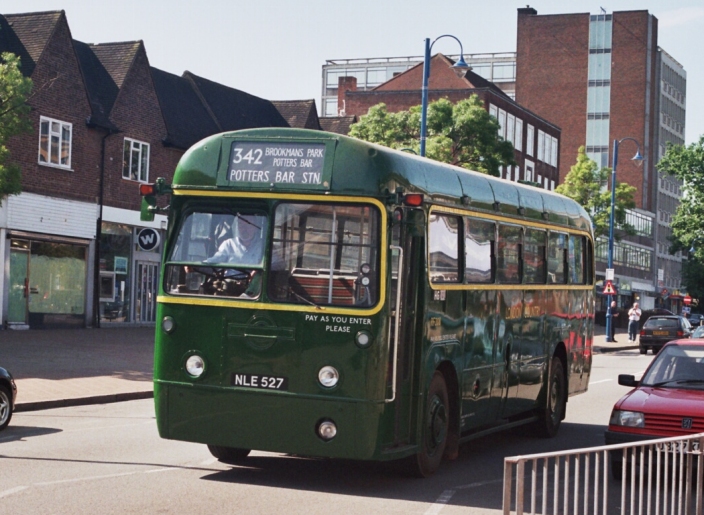 RF406 arrived, purring up the slope from Darkes Lane. This was LT's main postwar big saloon design: a forty-one seater in the maximum length allowed by Law: 9.0m, the same as a short 29-seater Dart. Originally all operated by driver and conductor, they were mostly later converted for one-man operation, as crewed single-deckers could not carry enough passengers to pay their way with the cheap fares of the time.