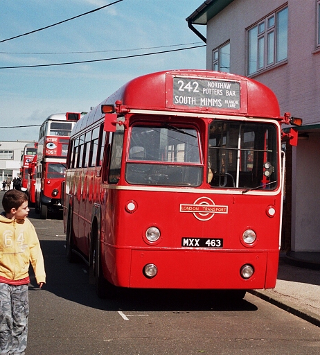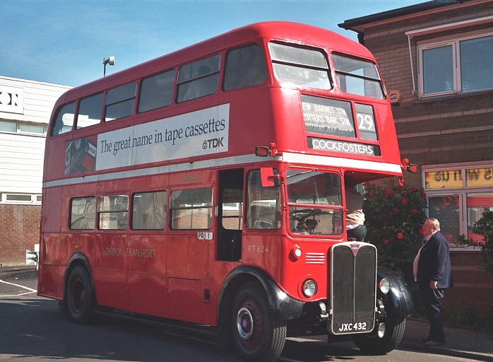 Representing a yet earlier episode in the RT history was RT113, one of those built early in the war years. These reverted to a traditional body-chassis relationship, with the platform carried on the chassis rather than cantilevered from the body like RT1 and the postwar RTs. The bodies were wood-framed too. But RT113 has been substantially rebuilt to avoid the worst ravages of passing time, and wears wartime livery of red and white with grey roof and white blackout trims. Just one headlamp too. Most striking, for most people, is the rear roofbox. Today it was to operate on a Country Area route, as seven green and one red members of the class did from Hertford in 1955-57.