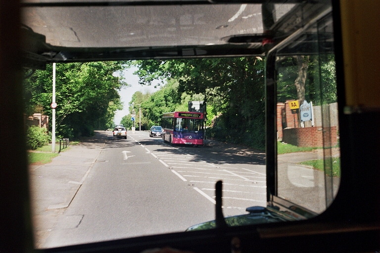 We reboarded, and continued north-westwards, drpooing down beside the M25 then passing under it. We kept the motorway company towards London Colney. Then crossed over it and turned into the village. We trundled through the pleasant village, and booked a stop on the way back. The big roundabout at the north end took us across the busy A414, and we followed the old road into St.Albans. Uno's Dart 152 passed us on a 602 for London Colney, a vision in pink and lilac.