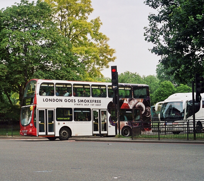 Marble Arch produced a flurry of activity. A DAF/Wright doubledecker wearing a striking ad about the coming smoke-free legislation was prominent, with a National Express coach and a Greenline lurking in the background. We continued down past Victoria, and crossed the Thames, for the slow wriggle out through the Sunday congestion to Balham and then eventually West Croydon, where I bailed out to catch a tram. It had been a fascinating trip across Central London in a green RT, a fitting finale to an excellent day. Thanks, folks.