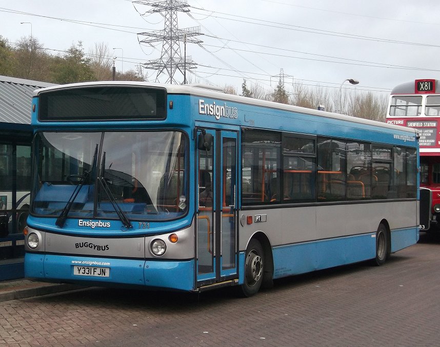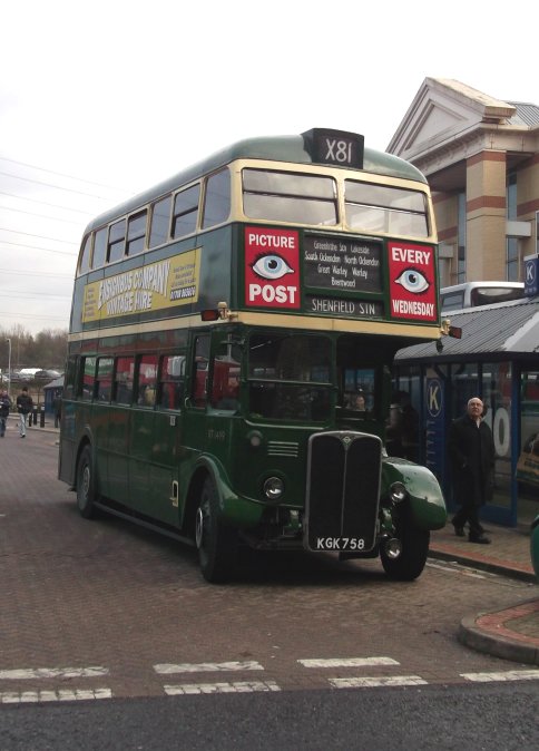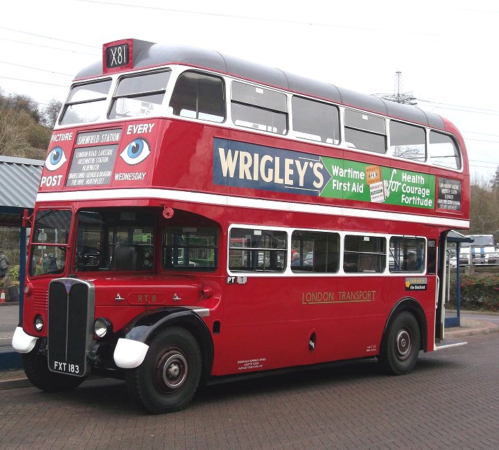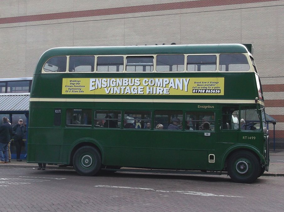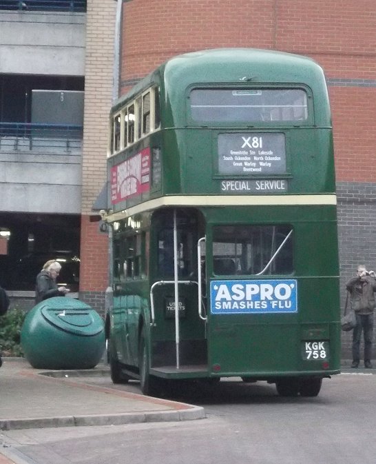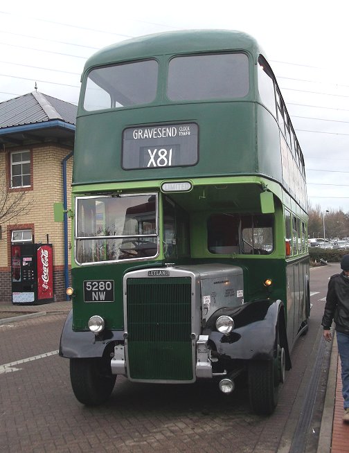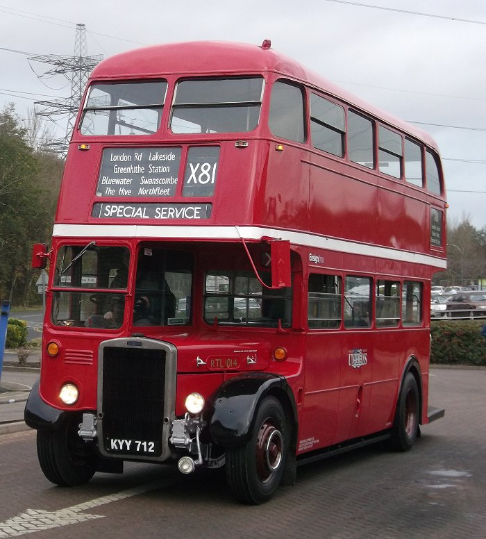 X81: Ensignbus Running DaySaturday 1st December 2012Prepared by Ian Smith, 6th December 2012.X81: Bluewater to Lakeside: RT1499Cravens-bodied RT1499 rolled up for the next northbound X81. I climbed inside, glad to be out of the cold Thames-side wind. RT4421, heading east, pulled into the Bluewater bus station as we left.We made our way along to the Dartford Tunnel, and dived under the river. Odd to think that this tunnel has been in operation for nearly forty years. We climbed up from the north portal, and wound our way through thecollection of roundabouts towards Lakeside. We met the doyen of the Metrobuses, arriving from Purfleet to take up service. I alighted from the Shenfield-bound bus at Lakeside, and paused to look at this RT with a very non-standard body: there were the five bays of windows in the saloon, shorter but deeper, not quite lined up with the windows in the LT standard cab. There was the squarer front upstairs, giving wider windows there, and a top deck slightly overlapping the cab at the corners, due to the lack of taper. Seen from the side, the rear curved over appreciably compared with the upright back of a standard RT. The uneven top to the upper deck windows is prominent too. Round at the back the view is even stranger, with the wide, low-set emergency window upstairs, and the narrow, deep, low-set platform window. Odd. Ensignbus has disposed of its Marshall-bodied Darts, Amongst the replacements are SLDs from Stagecoach London. 731, an Alexander-bodied example, was once Stagecoach SLD 331, later 34331. Behind the SLD stood RT8, set up for a turn on the X81. The war-time RT has been beautifully restored after its return from America, and wears war-time red and white livery, with matt grey roof and white blackout trims. Another repatriated bus from the USA was next in: RTL1014, fresh from many years of service with Unitrans, the student bus company of the University of California, Davis. The RTL, gleaming in a new coat of paint, retains most of its American features, such as the extra lights all over, the huge nearside mirror and a destination board on the rear. But it does now wear its UK registration plates rather than California plates. It had been intended for service today, but I gather it had been left overlong in gear, thus cooking the transmission. So although mobile, it was here only for show. Also arriving was Leeds City Transport Leyland PD3 5280NW. Metrobus M1 was taking over on the run south across the river. Having seldom travelled on any Metrobus, I climbed aboard for a different experience..