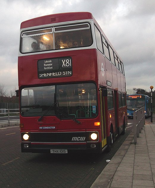 X81: Ensignbus Running DaySaturday 1st December 2012Prepared by Ian Smith, 6th December 2012.X81: Greenhithe to Lakeside: M1It was M1 that turned up ten minutes later for the trip acroos to Lakeside. I went upstairs, but it was so steamed up that I returned to the saloon. The orange seat moquette, although it may have caused visual problems for the coach-fitters at Aldenham, is a cheery sight on a cold winter's evening.