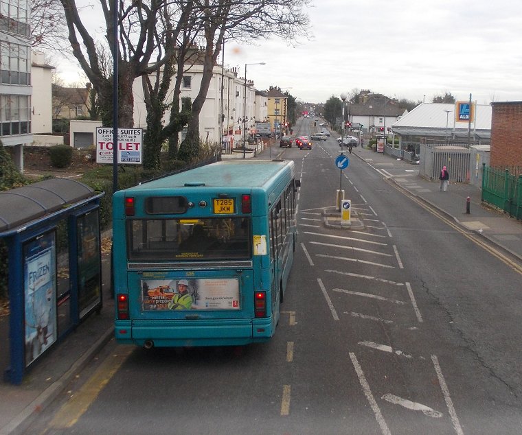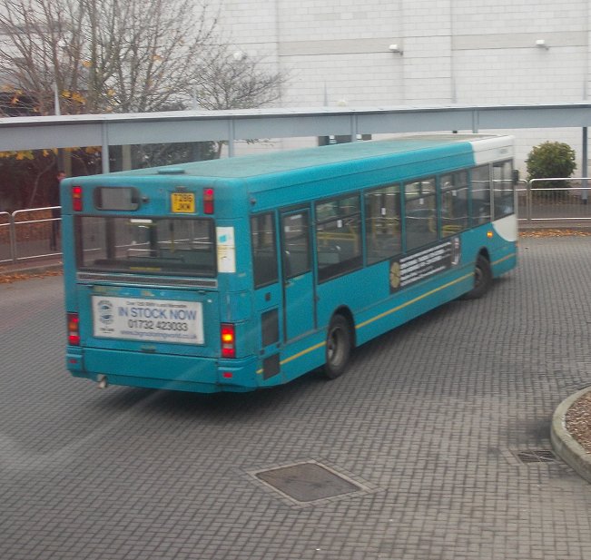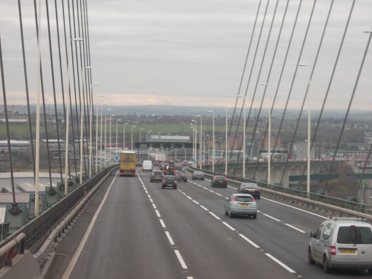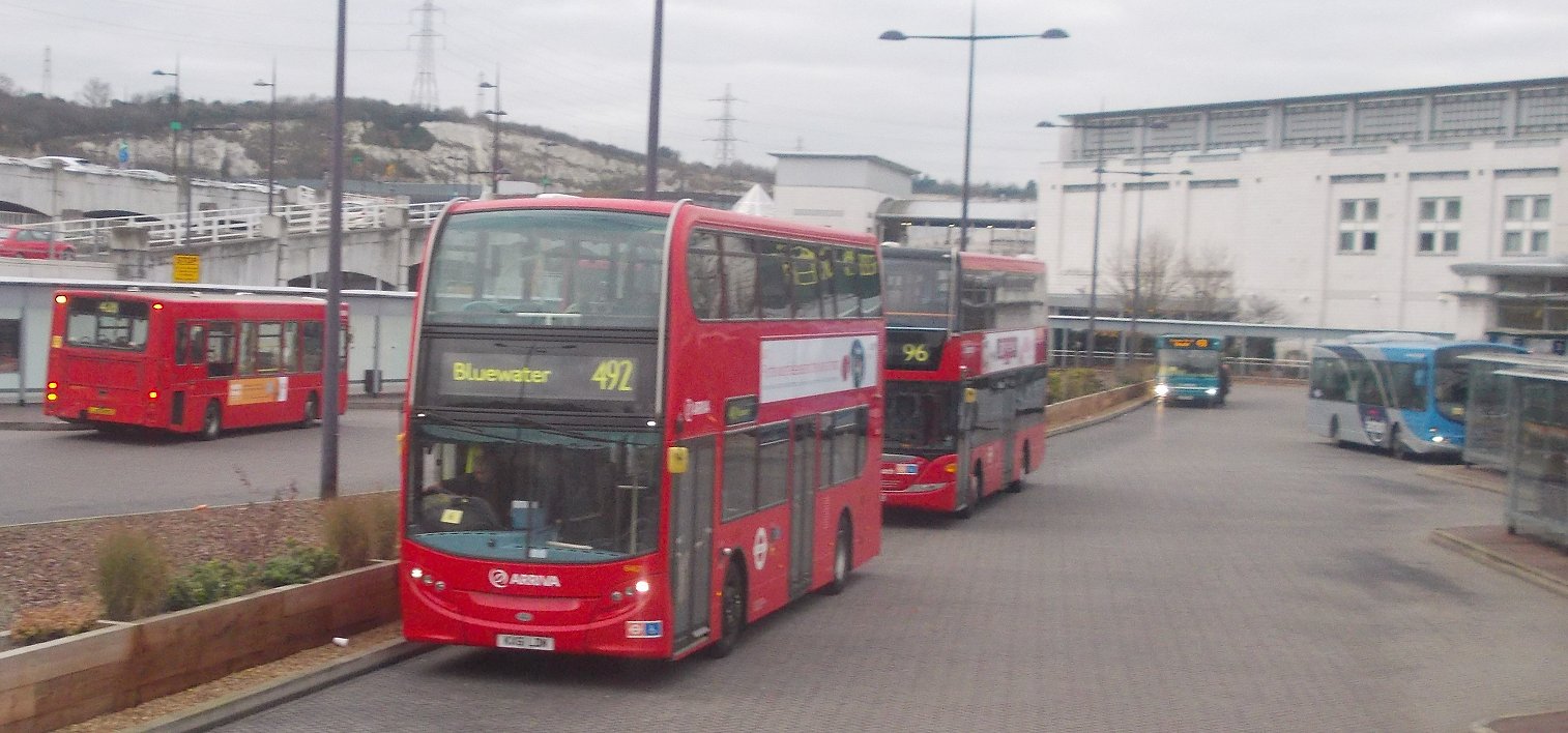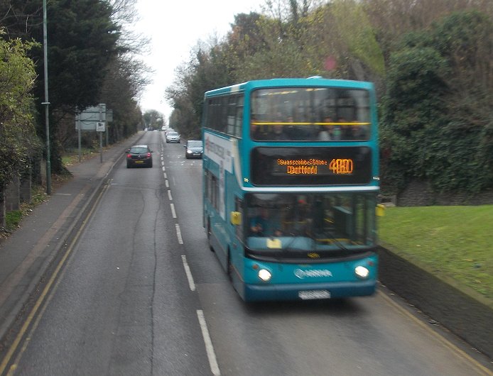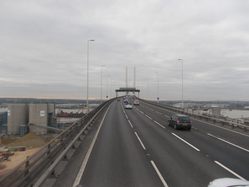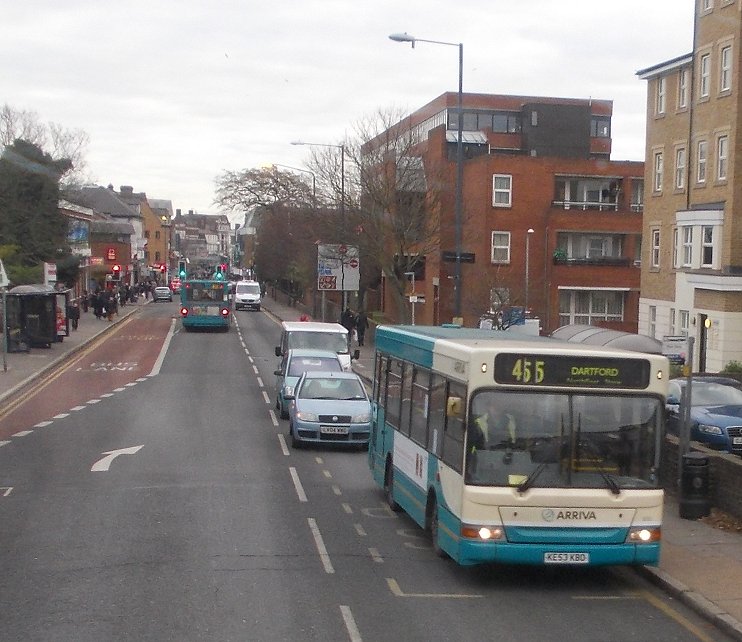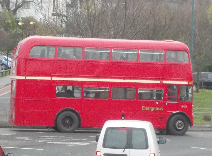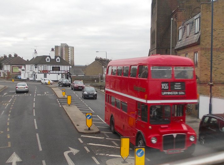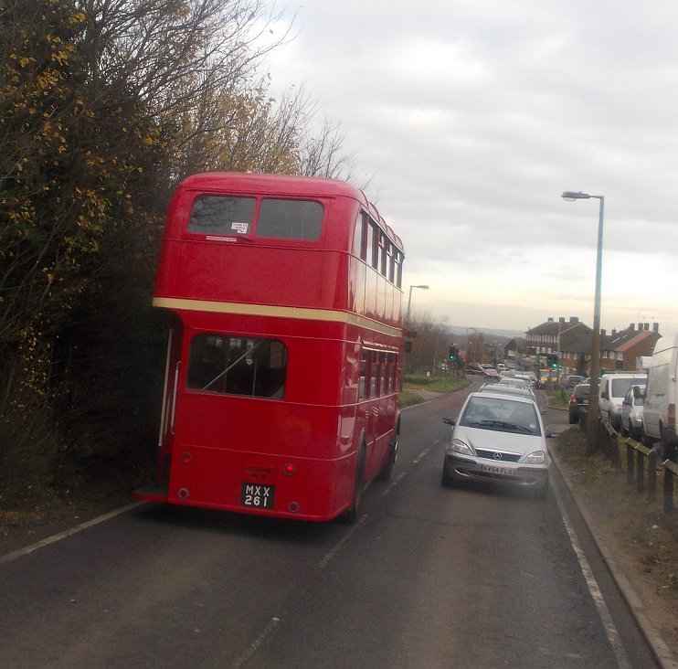 X55 and X81: Ensignbus Running DaySaturday 7th December 2012Prepared by Ian Smith, 17th December 2013.X55: Upminster to Gravesend (RT 3251)Having paused to take a picture of RTW335 from the rear, I was one of the last to board RT3251. I found a seat at the back, on the nearside long seat, where I could exchange greetings with our conductor.We headed south out of Upminster towards Corbets Tey, then worked west onto the Aveley Road. As we reached the first houses at Kennington Park I saw RLH61 coming the other way, and managed a picture from the rear platform as it passed. We continued down Romford Road into Aveley, where we picked a way through the town centre before continuing on towards the mess of traffic, pylons, railways and industry that makes up Thurrock. We negotiated three roundabouts, taking us under the M25 and eventually down into Lakeside, to the bus station. There I had a minute or two to see my bus from the front. It had emptied out somewhat, so I could find a seat upstairs at the front for the onward journey. The bus station was curiously empty, although I did catch a glimpse of Cub C4 approaching through the shopping centre as we pulled away. We climbed back up out of the shopping pit, and renegotiated the roundabouts to reach the M25 sliproad up onto the Queen Elizabeth Bridge, to soar high over the Thames. The views were superb, even in today's subdued winter lighting. We climbed the slope, then the first slip-road, on the Kent side of the toll-booths, then turned back down towards the river, getting a great view of the bridge swinging down towards us. As we headed east through Stone we could see an RTL coming towards us. A lamp-post persistently blocked the front view as it approached, and still featured in the side view as RTL1014 (the repatriate from Davis, California) swept past. We climbed up to Greenhithe, where we had a couple of minutes waiting time. Setting off, we passed under the railway, and then met the London Road at the roundabout, where RM54 from Gravesend turned left to head for Bluewater, followed by Arriva's DAF/Wright 6214 on the 492 from Sidcup. We followed them down into Kent's big shopping pit. We entered the bus station, which held a scattering of typical modern buses, single - and douuble-deck, including Arriva's AD Enviro400 6467, also on the 492. We pulled into the stop behind RM54. Elderly Dart SLF 3286 of Arriva Kent Thameside pulled past us to turn at the end of the bus station, probably on route 433. We followed RM54 through the twists of getting out of the bus station, and up to the Greenhithe roundabout. The RM went straight on, for Greenhithe station, while we turned right up the cutting of London Road. A surprise was Arriva's DAF/Alexander 6235 coming down the bank on a 480 to Dartford. Usually this route is just single-deckers. We continued over the hill, with its tremendous views east down-river, and dropped down to Ebbsfleet. We climbed up the bank from the Plough, and met RMA50 heading for Upminster as we passed Northfleet Church. We went along the high ridge road of Northfleet, with the Thames riverside estates occupying the old quarries down on the left, and old quarries also occasionally visible down on the right. We passed a more usual bus on the 480: VDL/Wright 3754, then came up behind older Dart SLF 3285. We followed it on down into Gravesend, on the way passing Dart MPD 1600 on the back-roads route 455 to Dartford from Valley Drive and Singlewell. We piroetted past Gravesend Station, and descended to the riverside, to our terminal stop beside the Tilbury Ferry Terminal. There we met RTL453, about to depart. I swapped buses for the ride back to Bluewater...