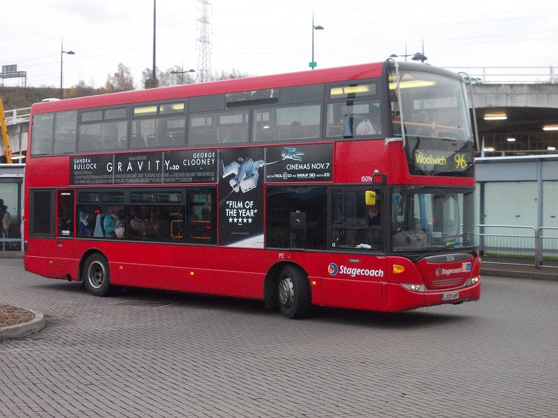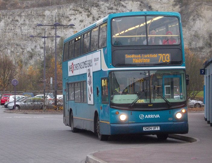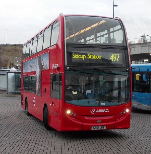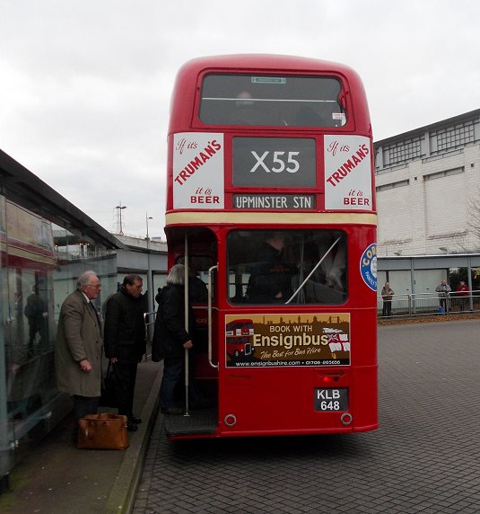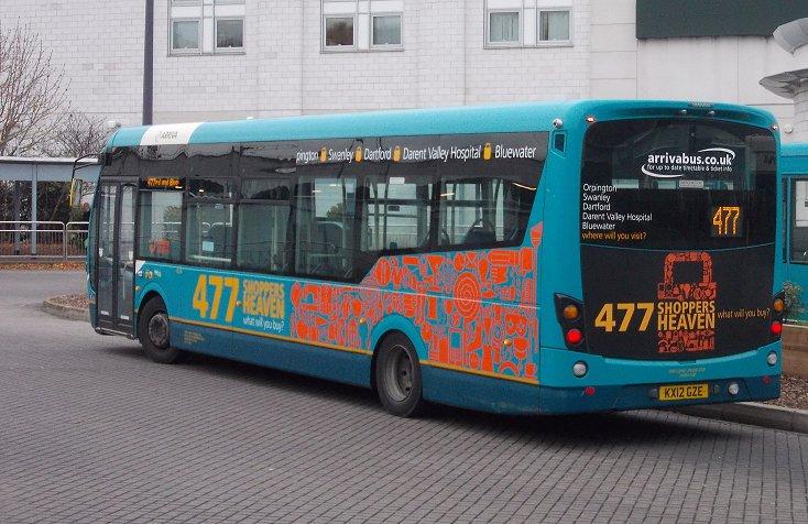 X55 and X81: Ensignbus Running DaySaturday 7th December 2012Prepared by Ian Smith, 21st December 2013.X55: Gravesend to Bluewater (RTL 453)I joined RTL453 for the journey back to Bluewater. We circulated up the hill and round past the Clock Tower and into the centre of Gravesend. We were allowed through the bus gate, and paused at the station stop. Then we headed for the high road through Northfleet. We met RLH61 coming the other way, then passed Northfleet Church and descended to Swanscombe. We climbed again, crossing over HS1 before descending again to Greenhithe. Turning left there, we descended into Bluewater, where I alighted. I watched the RTL depart, then headed into Marks and Spencer to find lunch in their cafe. BluewaterA half-hour later I returned to the bus station, with half-an hour to go until the RLH was due. There was plenty of activity amongst the regular bus services.3822, one of Arriva's 12.0m Volvo B7RLE/Wrightbus Urban Eclipse 41 seater saloons for Fastrack services was on route A to Dartford. Transport for London stretches out beyong the Greater London boundary to reach Bluewater with several services, including the 96, run by Stagecoach, and the 492, by Arriva Kent Thameside. Stagecoach's four-year old Scania OmniCity 15096 headed for Woolwich. Arriva's 2011 EnviroTrident 6463 was going to Sidcup on the 492. Resting between duties was much older Volvo Olympian 5936, dating from 1997. This had been on the 489, serving Perry Street, Southfleet, New Barn, Longfield and New Ash Green, essentially the old GS / RF 490 route with the 489 ending. Rather bigger than a GS! However, it does seem to have suffered along the roof-line from local foliage. Bluewater also attracts custom - and buses - from the Medway valley. Arriva Southern Counties Tridents 6447 and 6417 set off on the 703 to Maidstone and the 701 to Luton & Walderslade. The 477 from Orpington to Bluewater has also received new rolling stock, in the shape of heavily branded Wrightbus Streetlite DFs, such as 4220. EnviroDart 4001 brough a welcome splash of red to Bluewater, taking on the crowd that had been waiting quite a while for the 428 to Erith. Then, in the fading afternoon light, RLH61 arrived to take me back across the river...