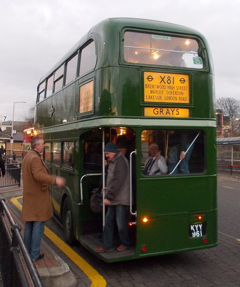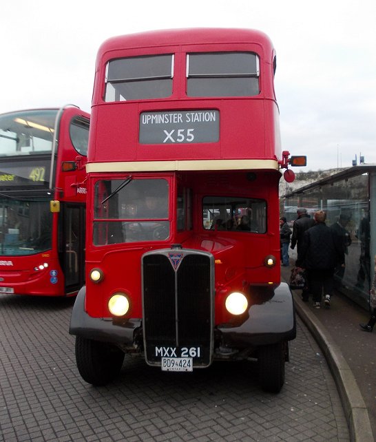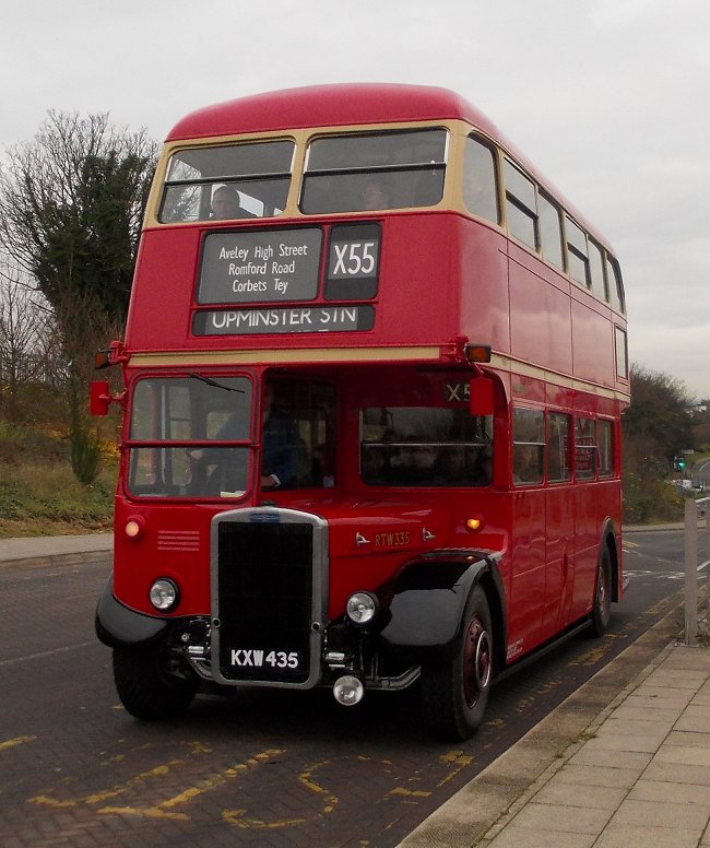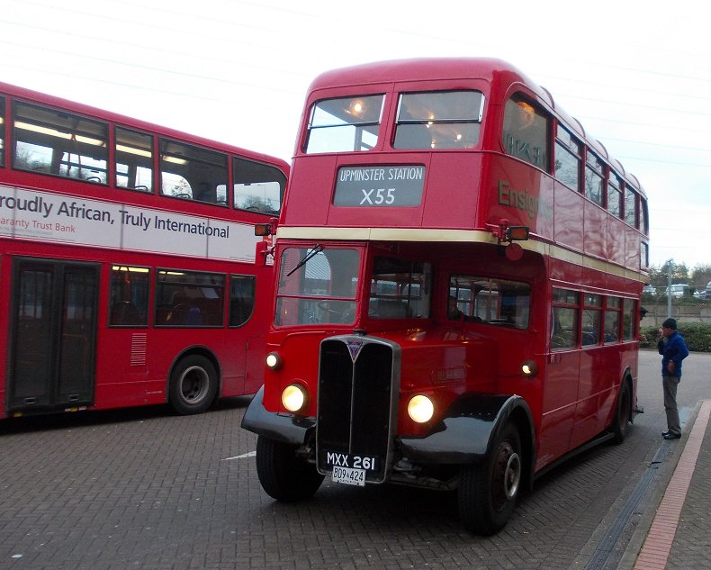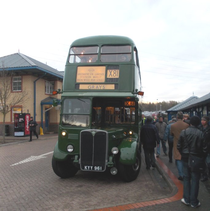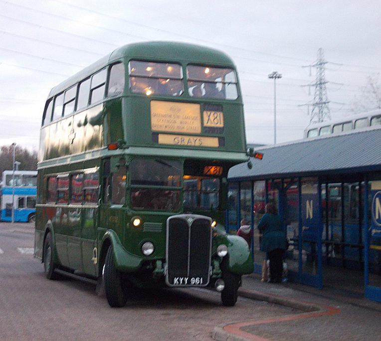 X55 and X81: Ensignbus Running DaySaturday 7th December 2012Prepared by Ian Smith, 21st December 2013.X55: Bluewater to Lakeside (RLH 61)RLH 61 turned up at Bluewater on schedule, and I found a seat behind the tall Regent III bonnet, with its associated deeply curved window. Our driver climbed back into the cab and we were away.We climbed out of the Bluewater pit, and visited Greenhithe Station before heading north along the riverside road through Stone. Green Cravens RT1499 came the other way. We turned up the hillside beside the toll booths of the Dartford Bridge, crossed over the M25 and took the slip road down to the toll-booths, before descending into the depths of the Tunnel.