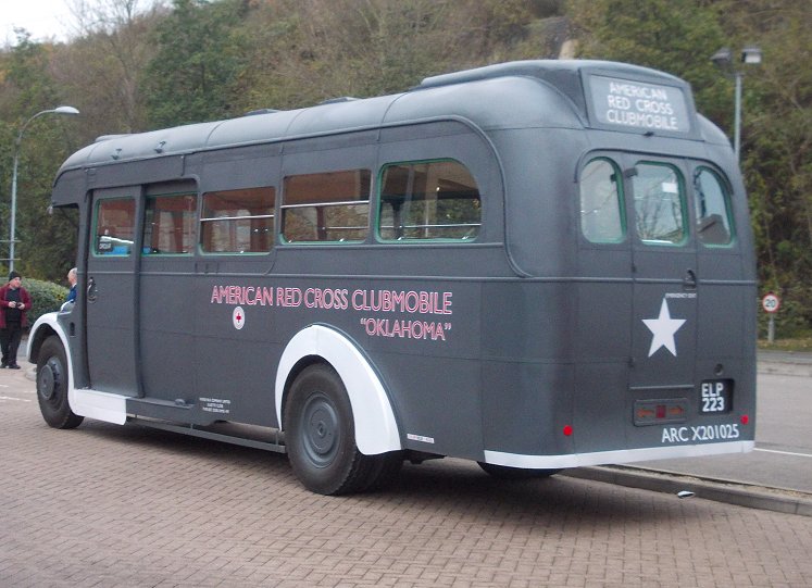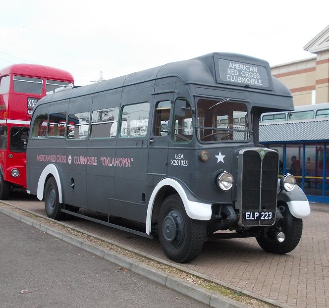 On the Thurrock shore we made our tortuous way round to Lakeside, and descended to the shopping centre bus station. There I alighted and got a better view of RMA50. LakesideStanding ahead of the RMA was another of the day's big surprises: Regal T499 - the repatriated coach from Australia - had completed its restoration with Ensignbus, who, unable to get it into full Greenline livery in time for the event (so I was told), had finished it in the matt grey of the American Red Cross, who had operated some of these buses as Clubmobiles during World War II. They had served up burgers and cola to troops then, and had both cooking and sleeping accommodation. The present T499 does not have those facilities, nor the female attendants, but nevertheless looks great as "Oklahoma". It had been running short trips around Lakeside, but when I saw it was receiving attention from Ensign's fitters. It provided an interesting comparison with First Essex 69911.
