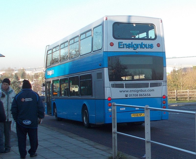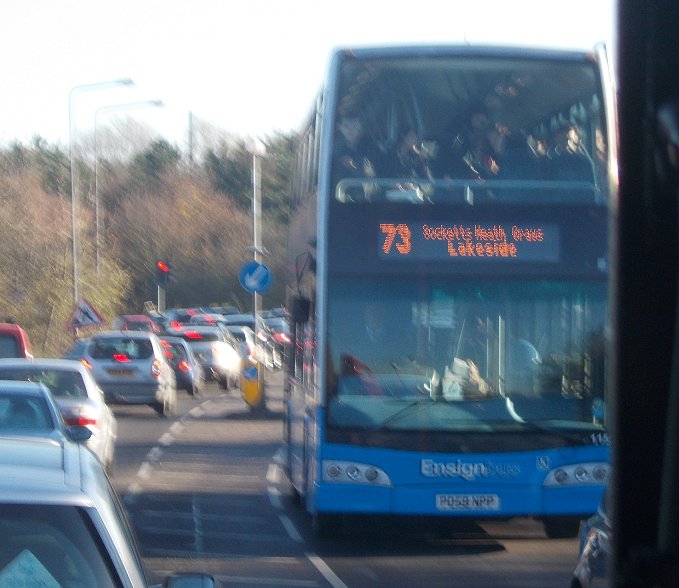 X81: Lakeside to Grays (RML 2588)I intended to wait at Lakeside for the next X81 to Grays, and expected to wait nearly half an hour. But RML2588 was running late, so I hopped off RM1843 straight onto the RML. At least I hjad a seat, immediately behind the driver. We pulled out past RT3251, which was heading south for Gravesend on the X55.There had been some traffic problem in Lakeside, so instead of circulating clockwise round the inside perimeter of Lakeside we climbed back up for an anti-clockwise evolution round the outside of the pit. We were still held up by traffic queuing to get into the shopping pit. We passed Arriva's EnviroDart 4070 heading in to Lakeside on the 370 from Romford There were other buses along the way, mostly in Ensignbus blue and silver. Olympus 115 squeezed past as we waited in a traffic jam. We passed through West Thurrock and headed east into Grays, where our driver missed a turn in towards the station, and instead took us round the town and back into the station from the east. Grays Bus Station was busy, with First Essex and Ensignbus services. These included EnviroDart 708 heading east for Tilbury on a 66. I alighted to get a picture or few while RML2588 was at Grays Station, then climbed back aboard for the trip to Shenfield..