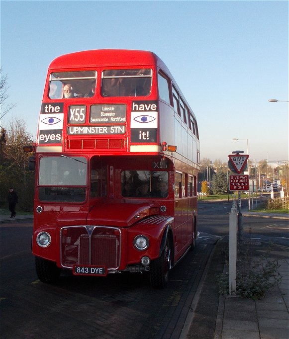 X55 and X81: Ensignbus Running DaySaturday 6th December 2014Prepared by Ian Smith, 13th December 2013.Getting to GreenhitheIt was a very cold, very frosty morning. The cars in the street were covered in beautiful frost flowers. The first bus to come along was a 126, so I caught it. Metrobus' EnviroDart 759 took me to Mottingham, where I bought a ticket to Greenhithe. As I crossed the station bridge my Gravesend train, headed by 466006, rolled in. Excellent timing! That rolled me comfortably east to Dartford, and on to Greenhithe.X55: Greenhithe to Lakeside (RM 1843)At Greenhithe I had a wait for my first heritage bus. Ensign's Optare Olumpus 112 passed through on its way to the shopping emporia at Bluewater.Just as last year my first ride was on a bus newly back into service, so it was this year. It was RM1843, repatriated last year after twenty-eight years in the USA, and restored to pristine condition. It was full. Standing room only - and that only just. So there were no pictures on the way north to the Dartford tunnel, nor eastwards to Lakeside. The Leyland engine sounded excellent.
