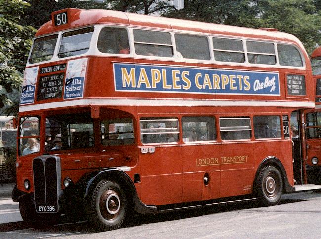 RT1 in its second livery. (Ad colours are guesswork)In this livery it entered service from Chelverton Road garage in Putney (AF), where it was in service from 17 June 1939 until October 1945. In 1945 the chassis was withdrawn, and the unique body placed on the chassis of RT 19. This new combination was numbered RT19, (FXT 194).