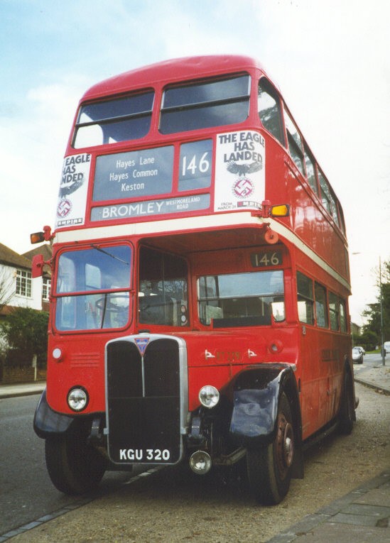 Construction:The standard RT was a straightforward development of the roofbox RT. Almost the only immediate difference was the blind layout at the front of the bus. In place of the roofbox and dual blind, there was a three-window blind on the front, with the route number panel on the near side. The route number was repeated in the small box under the canopy, as on the RT10s and the Saunders' RTs. The revised destination blind layout took effect with some of the buses delivered in 1948, coded RT3/1, although RT3 roofbox bodies continued to appear until 1950.A new means of fixing body to chassis brought the new code of RT8 for the new standard buses. These could be identified by the small cut-out above chassis horns below the drivers cab, designed to clear the larger fittings on the RTL chassis, so making them interchangeable. (The RT10s had this cut-out too). Later buses had a redesigned, stronger, front bulkhead. There was no visible difference, but they were coded RT8/2 Preserved RT2291 in Hayes, Kent, December 1998.
