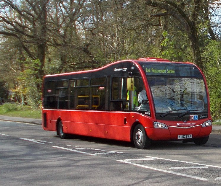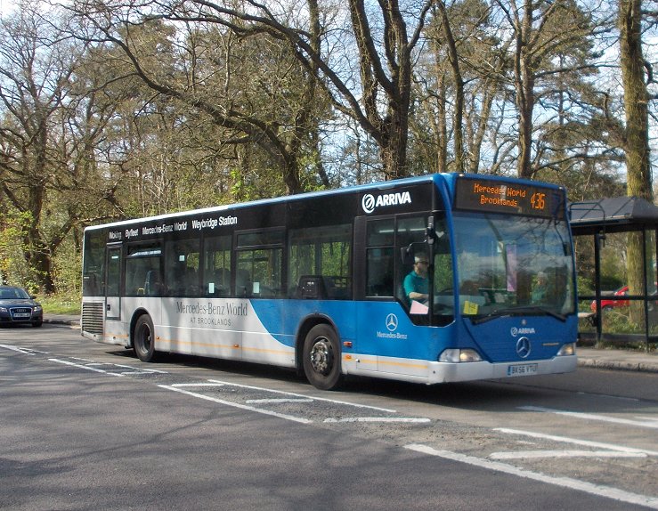 RT75Sunday 12th April 2014Prepared on Wordpad by Ian Smith, 26th April 2014Part 5: London Bus Museum, Brooklands462: Weybridge Station to Brooklands: OPL08I trundled out to Weybridge on Stagecoach Southwestern Trains' parrot-livery 5836. It was a lovely fine morning, and crowds were packing the platforms in the other direction, off to London to catch a glimpse of the London Marathon.At Weybridge Station I made my way to the bus stop over the railway bridge - no longer do RFs turn on the station forecourt. A privately preserved RM came past, heading for the RM display at Brooklands. Mercedes-Benz Citaro 3901 grumbled past in the other direction, on the Mercedes - sponsored 436 service linking their Mercedes World centre at Brooklands with the real world. Then RML2760 rumbled up, followed by Quality Line's 9.3m Optare Solo SR OPL08. This pair swivelled round the station roundabout and returned to take on board the massive queue. It took both buses, with standing, loading over a hundred people for the short trip to Brooklands, where we entered through the east gate, descending steeply across the Brooklands race track.