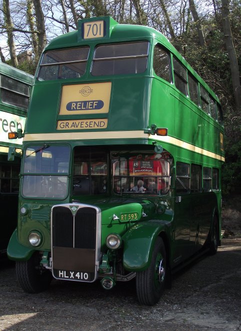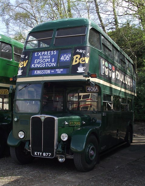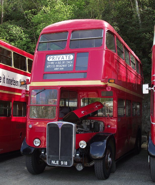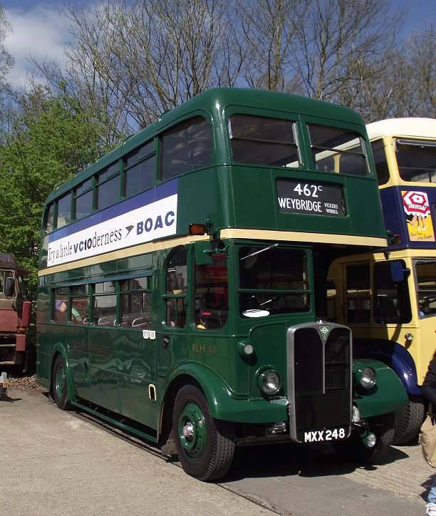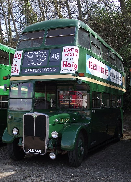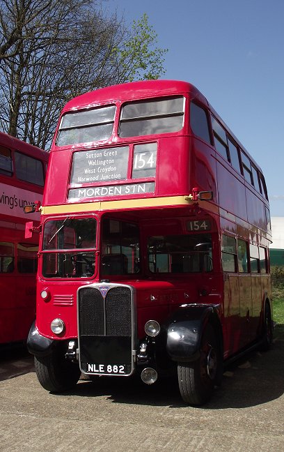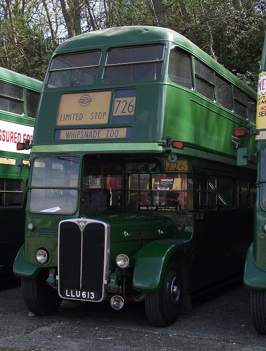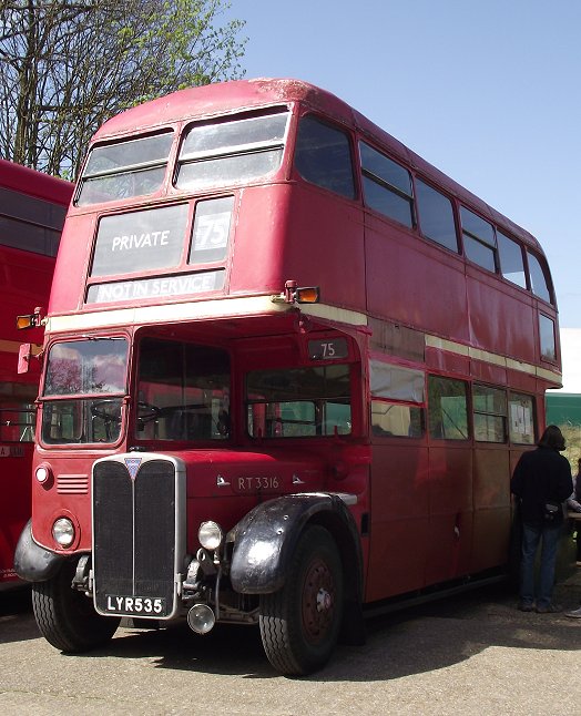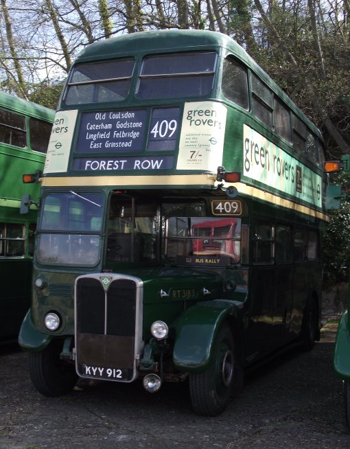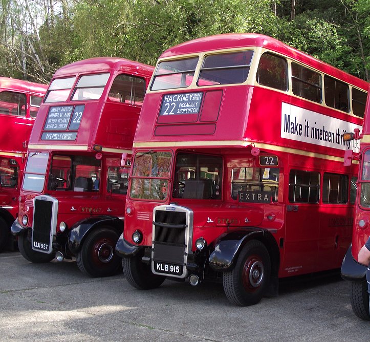 I alighted from the bus at the control point, and went to see the ordinary delights of a Cobham gathering, leaving the RT display until after I had seen what else had visited. The Museum itself, which was occupied by trade stalls so that the buses were difficult to see, I left until later. Brooklands: The RT displayThe RTs were parked up on the bank behind the Museum tent. First, of course, was RT1, the only 75 year-old - well, the body, anyway. Next to it was RT3028, now earning its preservation with The Old London Bus, Hawkhurst.Next came a quartet of Leylands: RTW185 in the early livery, RTW 467 and RTW75 in later livery, and narrower RTL139. A trio of RTs showed a little of the family variety within the common theme: RT2775 has been restored to its USA tour condition by the London Bus Museum, while John and Gill Hinson's RT1784 is a rare RT3 model, with roofbox, valance and route number holder on the nearside bulkhead pillar. It sports the early post-war livery too, with the austerity-period reduced blind displays. John Herting's RT2177 is a standard Weymann-bodied RT8, dressed in the later livery with very pale grey band. Working up the row was further variety: RT2293 - another Weymann RT8, but in the 1950s-1960s livery with cream band; RT2657, another Park Royal roofbox RT3, returned to this country from the AMTUIR collection in Paris; RT1431, a Cravens-bodied RT, superficially similar but very different on close inspection: the only common features were the chassis and the cab! RT1396 is one of the rare Saunders-bodied roofbox RT3/3s, now with Swansea Museum. RT1705 has an early roofbox (RT3) body. RT935 - with a polished metal frame to its driver's window, is a standrd RT8. RTs came in green too, of course.The Country Area received many of the high number ones, such as RT4494. This was actually new as an RT8/1 GreenLine coach - which meant it had a green band, a metal bulleseye between decks and no adverts. Later it became a Country Bus at overhaul, fitted with one of the Loadmeter bodies for assessing passenger loadings. It has undergone a significant overhaul, involving a new riser and platform. It is good to see it here, wearing GreenLine blinds for the Grays 723, where it began. RT3254 was also a GreenLine bus, at Romford from new. So today it wears Romford plates, slipboard and blinds, in this case for the Baker Street to Whipsnade sevice. Later it was a red bus, one of the last at Barking, before being preserved back as a GreenLine coach. RT4779 was a Country Bus for its first fifteen years, then spent ten years with the Central Area. After a career in the film industry, where it was scorched on one occasion, and being used as a Christmas tree, it was secured for preservation. Missing bits were located or fabricated, and RT4779 is back as a Country bus. Hooray! RT593, a RT3 roofbox bus, was a Central Area bus for all its fifteen years of service. It was early into preservation, being preserved for over forty years. But it does look good in green! RT3183 looks just the way I remember Country Area buses in service (I left the London Area in 1970, so missed the later Country paint variations.) RT3491 was another Central Area bus that turned green upon preservation, back in 1973. It has spent an active life in preservation, being maintained as a PSV and used for hires. The GreenLine livery suits it. RT604 wears London Country NBC green and white livery, quite legitimately: it was April 1977 when it received this livery at repaint, and September 1978 before it retired with a cracked block - the last RT in passenger service for London Country. It was almost immediately acquired for preservation, was repaired, and appears regularly at events. RT3148 has been out of sight for three and a half years, undergoing remedial work. Today it wears unusual 406A Express blinds. RT2083, I don't know why, started off as RT2084, but was reregistered and renumbered in preservation. It was also a red bus with LT, but has been green in preservation for as long as I can remember (and more). At the top of the opposite row was an RT chassis without a body: RT4325, to judge by the registration, which last had a red roofbox RT10 body. Then came the St.Helens Corporation RT #67, and the London Transport Museum RT4712 that had been painted gold for the Queen's Jubilee in 2002. Guernseybus open-topper RT2494 was #14 in the Guernseybus fleet, and returned to the UK after 13 years on the island. RT3316 is another RT that is new to me, having just changed hands in preservation to Steve Downing. RT3775 is a bus with an interesting history. It spent nearly twenty years as a Central Area bus, before preservation in 1972. It actually was hired by LT as a trainer in 1978. It was bought by London & Country in 1994, who painted it green and put it towork on the 473 between East Grinstead Station and the Bluebell Railway at Kingscote. Retired again, it was bought by Ensignbus and went into blue and silver livery. Bought for private preservation it has reverted to red. A trio in the RT17** range followed: RT1777, dressed as a trainer, RT1798, and RT1702. Completing this line of RT family buses were RT4139 and RTW497, the latter at first glance looking scruffy but on second viewing being part way through a rub-down for a repaint. London Transport's lowbridge buses were not actually low-height RTs, but Regent IIIs, but they are certainly worthy of inclusion here. RLH32 (in Ledgard livery) and RLH48 were in the external line-up, while RLH53, recently repatriated from the USA, was lurking as the cinema bus in a corner of the big tent. Also in there was another chassis, of RT2213. Altogether a good show.