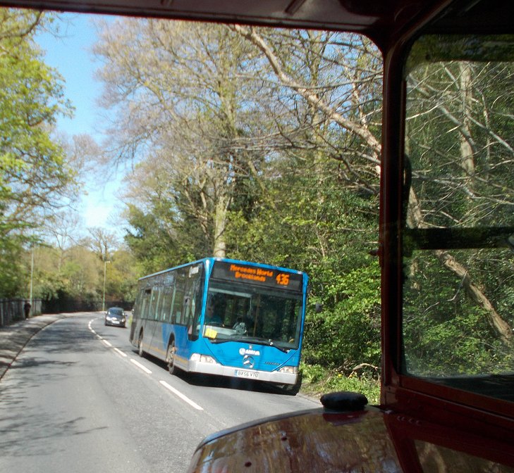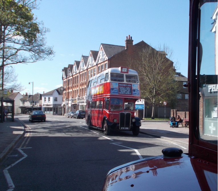 462: Brooklands to Weybridge and back: RTL139I grabbed a bite to eat, and sat on a tree-stump at the foot of RT Bank, just enjoying the sight. Lots of people clustered around RT1.Peter Larkham came hurrying past, heading for RTL139 on a trip to Weybridge. Why not? I hurried across to join him on the RTL, and settled in behind the bonnet. We gently eased our way out through the west gate and along the lane beside the runway, and turned uphill towards Weybridge. Inevitably we met one of the Citaros heading for Mercedes World - 3901 again. We reached Weybridge Station, where RTW75 was pausing on a journey the other way. We turned right beyond the railway bridge, to make an anticlockwise loop through Weybridge village. To my delight we met RT1 making a clockwise loop. Approaching Weybridge Station we saw GreenLine liveried RT3491 turning across ahead of us. Then beyond the station we met RTW467 rumbling northwards on a 462. We turned in to descend the steep bank to the east gate, where I alighted to pass through the Control Point. RT1 followed us in.