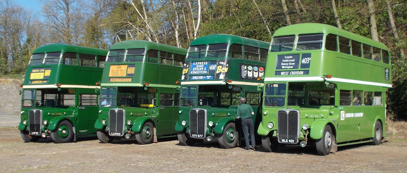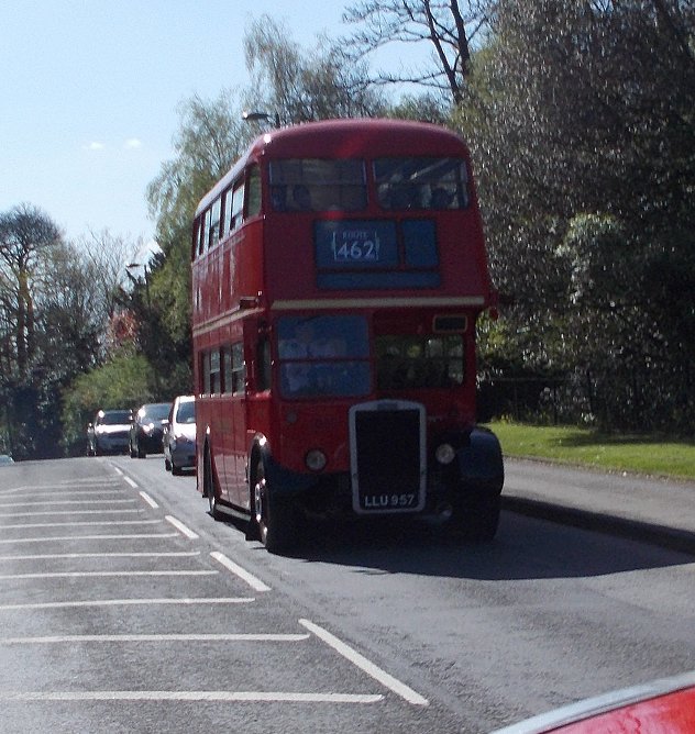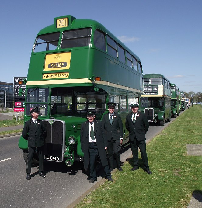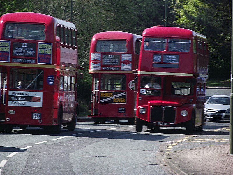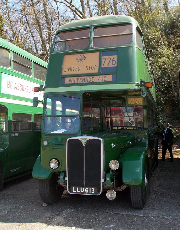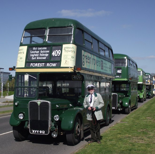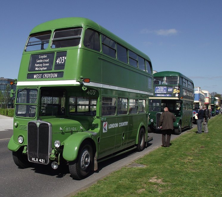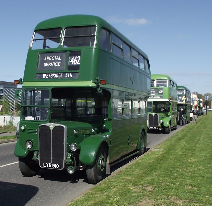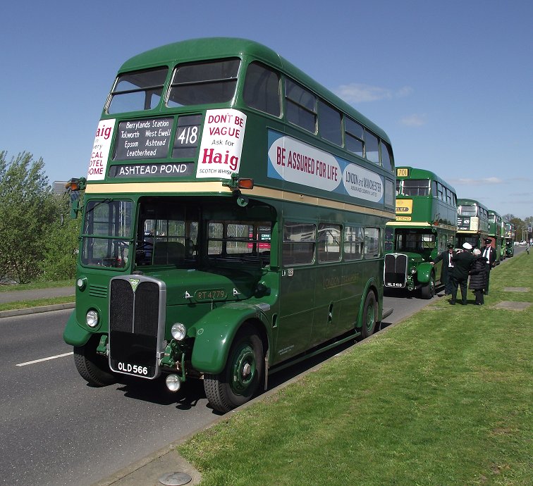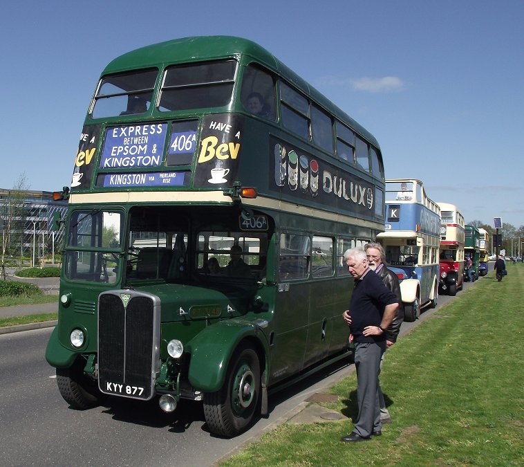 RT75Sunday 12th April 2014Prepared on Wordpad by Ian Smith, 26th April 2014Part 6: Run-outs from BrooklandsBrooklands to Brooklands Road-Run: RT3254Drivers began to mount up on the displayed buses, and gradually began to move out. The marshall wanted all the green buses together, so we hung back until the red ones participating had filed out, then followed RT1702 out past the bits of aircraft and cab-rank of Routemasters for the 462, past Concorde, out through the gate and onto the long straight road beside the old runway. There the whole column came to a halt for photograhs.I alighted from RT3254 and walked back to look at the long line of green RTs. RT4779 was the next back. RT593 was next, with crews assembled for photograhs, and RT3183 was next. I continued back down the line, to RT3491 and RT604. I reached RT3148, then noises upfront indicated that it was time for me to hurry back to RT3254 for the cavalcade to progress. RM324, on a 462 to Weybridge or a Park & Ride mission I think, had overtaken the stationary tail, and was ahead of us, behind RT1702. The RM turned left at the first roundabout, and we continued to the south end of the airfield, through the breach in the race-track onto the road from Byfleet. We circled left, back up onto the road to Weybridge Station. At another junction the two red RTs ahead of us turned left, following road-signs to the Museum, and we followed on. WE passed RM9 heading for Weybridge on a 462.Both RTs stopped behind an Atlantean beside the Park & Ride. Chris took us on to the roundabout, and turned right on the access lane to the Museum. We discovered that we should have gone the other way back up on the hill, to turn in at the east gate. Never mind. We pressed on to the Museum, passing Guildford's MPD 1630 (ex Arriva London PDL85), and entered by the west gate. We had to wait for most of those RTs that had gone the "correct" route to pass in front of us onto the bank, then took a place up near the top of the bank.