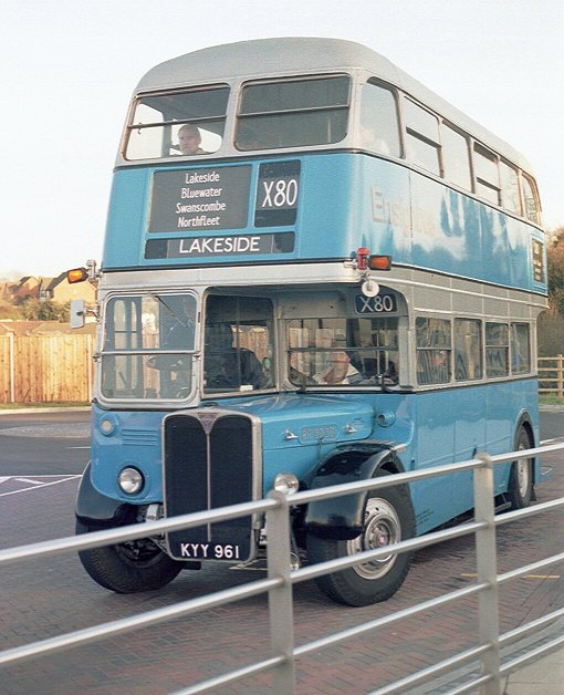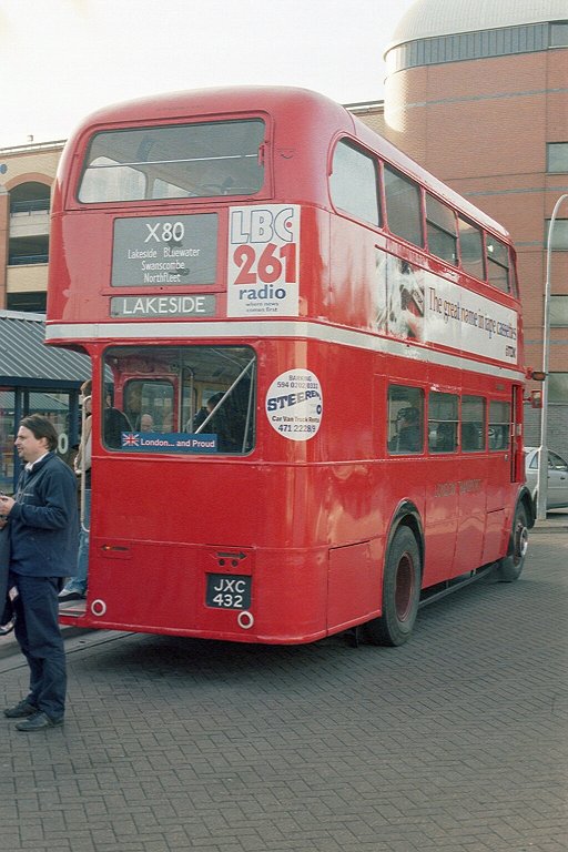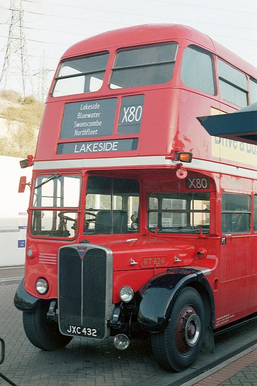 Soon we descended into the giant chalk-pit that now houses a huge shopping mall, and came to rest in the bus station. I alighted, and checked my bearings to see what left from where. I had been there only a few minutes when a familiar red shape appeared: an RT was coming. RT624 came bustling into the bus station, and I hurried along to climb aboard for a trip towards Lakeside.