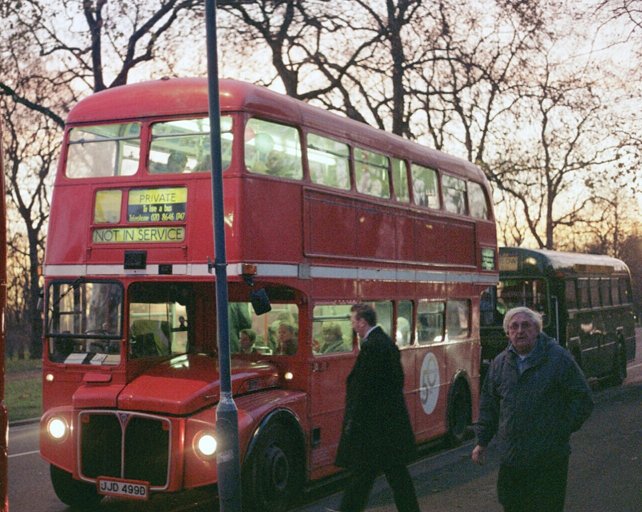 But it was time for the off. A whistle blew, and engines rumbled into life up and down the row. More buses were still arriving: an RTW and an open-top RT were seen to be on their way, but the head of the line was already departing. We turned round the roundabouts at Marble Arch and headed down Park Lane behind RT2177. Aboard the RF refreshments were being handed round.