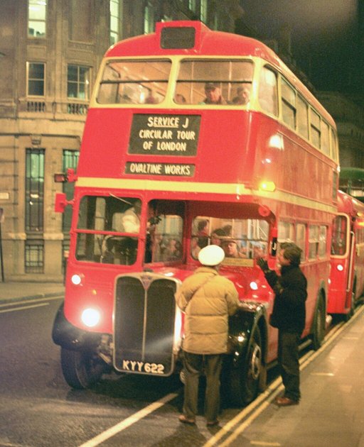 We turned east into Piccadilly, and rumbled along to Piccadilly Circus, where the lights were bright. We went on, into Shaftesbury Avenue, and into High Holborn, where we found ourselves behind the lead bus, RT1784. On into the City of London - and then stop. It seems that there was notice of a road closure on the intended route to Aldgate. Our driver, Peter Osborn, consulted with Gill Hinson on RT1784, and offered to lead the way round a diversion. So we took the lead for the short distance to Aldgate, where we let Gill past for the turn left off the roundabout system past the Tower of London onto Tower Bridge.
