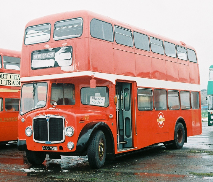 RV1 made an appearance in the snow at the Cobham Museum Open Day at Wisley Airfield on Sunday 6th April 2008.In 1991 it was bought by the Leaside Travel unit of London Buses for contract work and training, and was painted in London Buses livery. The Regent V thus found itself on schools contracts and rail replacement work. On occasions it was sent out on fare-carrying operations in London, such as special services to Lea Valley events, and also on the 38 when tube replacements were provided by extras on the route. It was privatised to Cowie Leaside, and continued into Arriva ownership. It was finally sold to Ensign in December 2005, and passed on into private preservation.