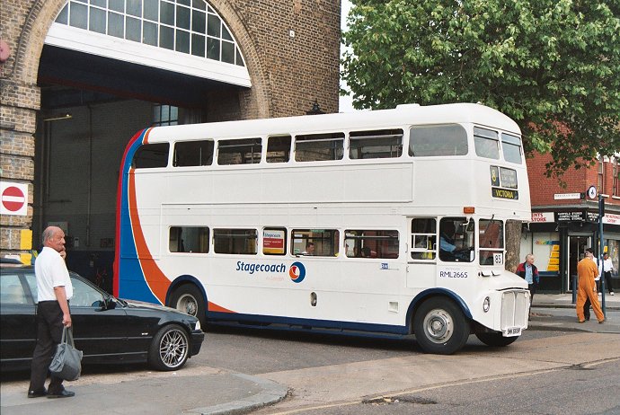 I walked back up Fairfield Road past the garage exit, where there were lots of photographers and people in high visibility jackets. RML2665, wearing its new Stagecoach livery, was standing in the exit awaiting a turn of duty.