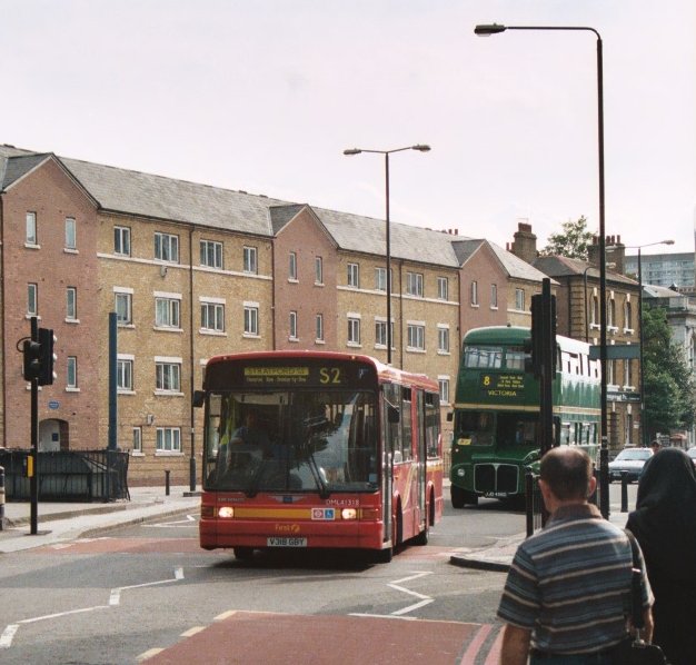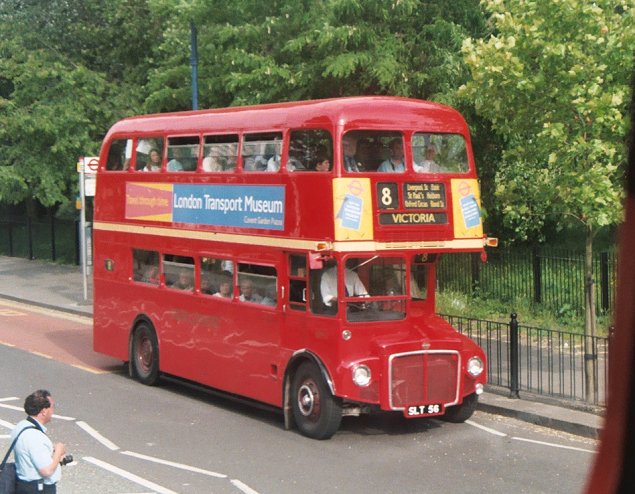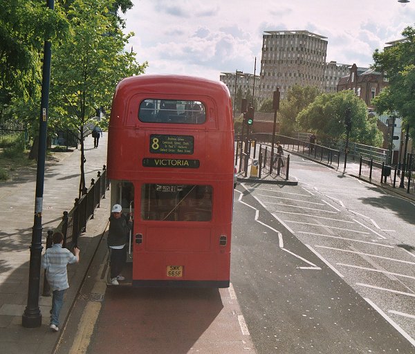 We threaded our way past the Bank, and turned left up Bishopsgate past Liverpool Street Station. RML2488 passed us in Shoreditch, then we turned east again onto Bethnal Green Road. RML900 passed by. Then as we made our way along through the traditional East End scenery of Bethnal Green Road another RTW came towards us. None for 38 years, then two come along together! Behind RTW467 was Trident 18217 maintaining the normal service.