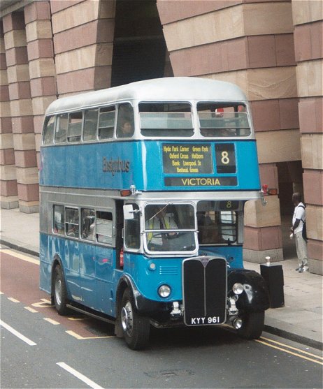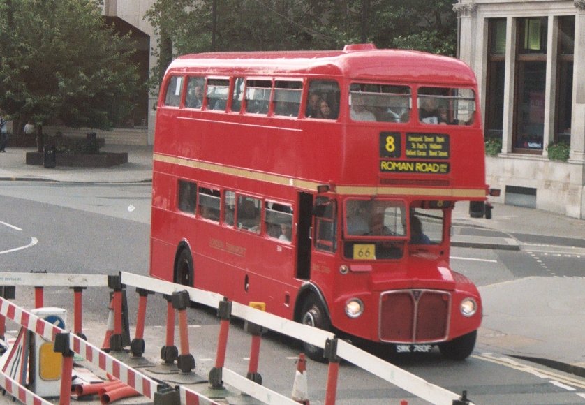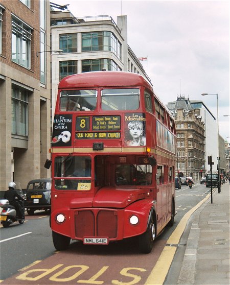 After my spell in the City near St Paul's Underground Station I thought I might head east to Bow on Route 8. I was lucky in that the next 8 along was another Bow RML, with empty seats at the front upstairs. I boarded RML2641, and settled down for the ride east. We passed round the one-way system and along Cheapside into Poultry. Coming towards us from Bank was yet another RT, this time Ensignbus' blue and silver RT3232. Then at the crossing outside the Bank of England privately-owned RMC1456, in red bus livery, headed westwards.
