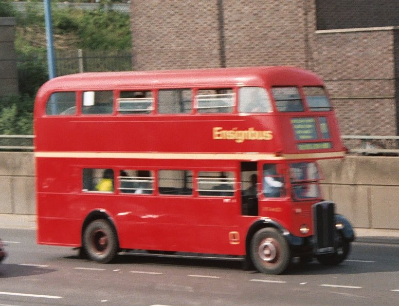 I returned to the stop, and after a few minutes green RML2456 arrived, following a DML on route S2. I was not so fortunate with seating on the return trip to London, which restricted my photography a bit. Nevertheless I grabbed a shot, out of the side window, of yet another RT - Ensignbus' red RT4421 - as we passed at speed on the motorway.