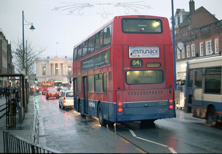 At least the slow traffic gave us a chance to chat and view the local buses. Universitybus 647, a Dart with Wright Crusader bodywork, came swishing down the wet hill on a 655 to Borehamwood, whilst ahead of us two of the ex-Sovereign Darts crawled up the hill, Centrebus 571 in green and 582 in Cottonmill Cruiser colours. Another of Sovereign's ex-fleet, a Volvo with Wright Renown body, now with Arriva The Shires, and in their turquoise livery with a white "cow-horn" and blue skirt, left the market at the top of the hill on a 301 to Stevenage. (but my photo was more of a blurry mess than usual!). It was followed by the other ex-Sovereign Beaver, Centrebus 454, on a 304 for Colney Heath.