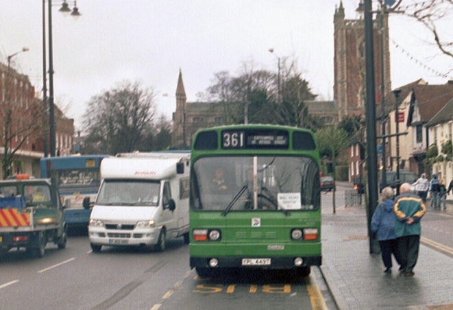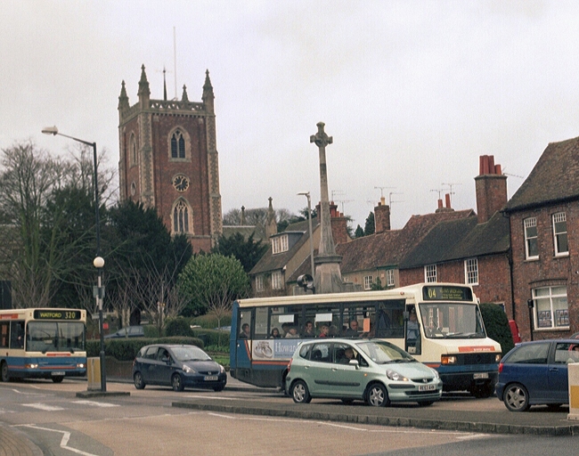 Ex-Sovereign Mercedes Beaver 451 was loading up for the short arm of the 304 to Colney Heath. Behind the RT had pulled up the Leyland National operating the Abbey Station service, SNB449.