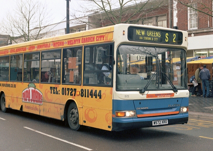 It was busy. All day St Peter's Street would be full of busy buses, weaving their way past the market stalls, impeded by the numerous 4x4s that felt the need to come along the street. I wondered whether it this full of buses in LT days. Another of the Wright Renowns paused, 3306 on its way to Hemel Hempstead. Also ex-Sovereign, but now with Centrebus, was Plaxton-bodied Dart 572, bright in a yellow based overall advert for Papa John's Pizza. The bus was not visiting them all, despite the "points" mentioned along the cant-rail, but was on local route S2.