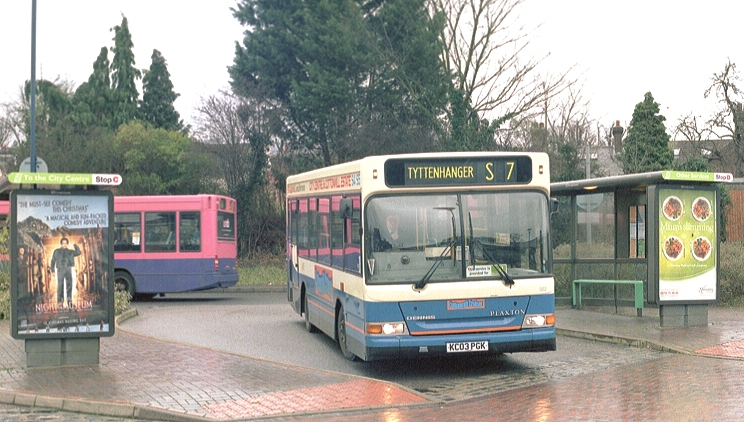 I emerged from City Station onto the bus stance. Centrebus Dart SLF 582 was sitting at a stand on the S7 to Tyttenhanger. Even on a dreitch morning it looked smart and welcoming in its Sovereign-style blue and cream.