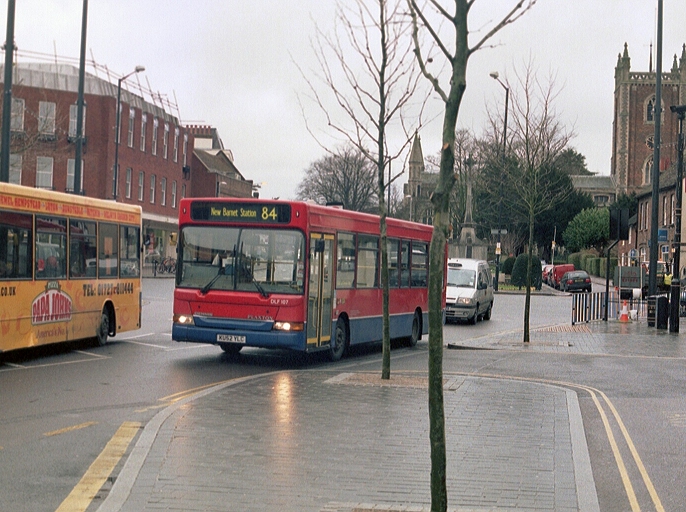Since last year St.Albans has lost its remaining double-decker route - the 84 to New Barnet Station. Now it too is single-decker, Metroline having cascaded onto the route single doorway Darts from the Thorpe's operations. DLF107 turned round the roundabout in St.Peter's Street to reach the terminal stop.
