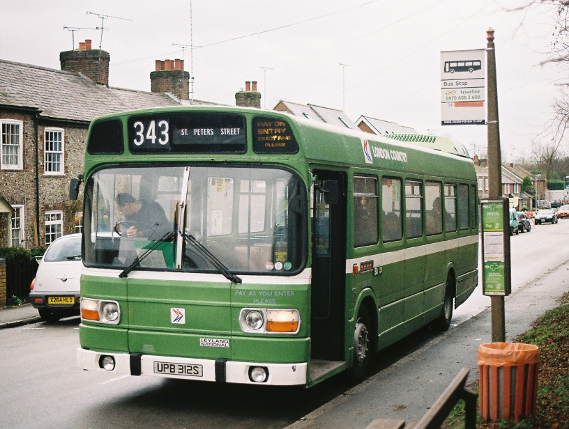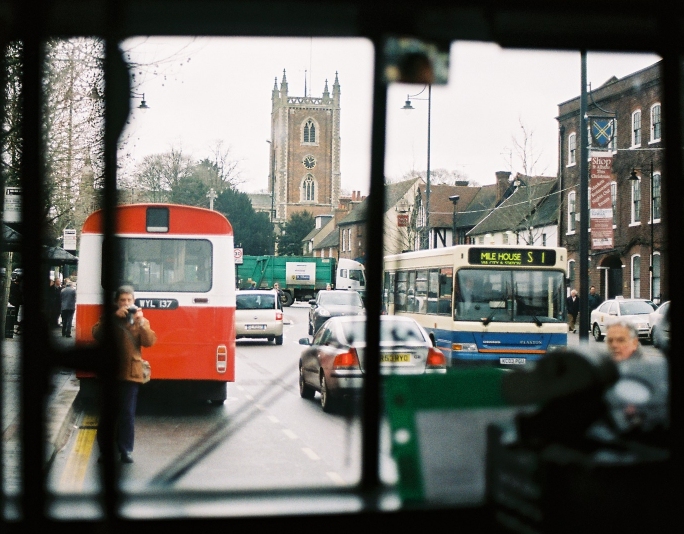We zoomed south. The tight schedule left no slack, even for a relatively modern bus. At Redbourn we turned in through the bus-only gate to reach the village street, and eased southwards. Then it was back onto the straight Roman Road towards St.Albans. This gave us an excellent view of the Abbey on its hill as we approached the city.