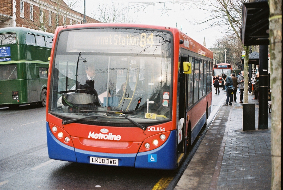 LS444 was not quite ready. I walked down the street to look at the latest offering on the 84. Metroline's Enviro200 Dart DEL854 looked very smart, even if its exclusive use on non-TfL routes enabled it to use a scrolling digital display instead of more-visible printed blinds.