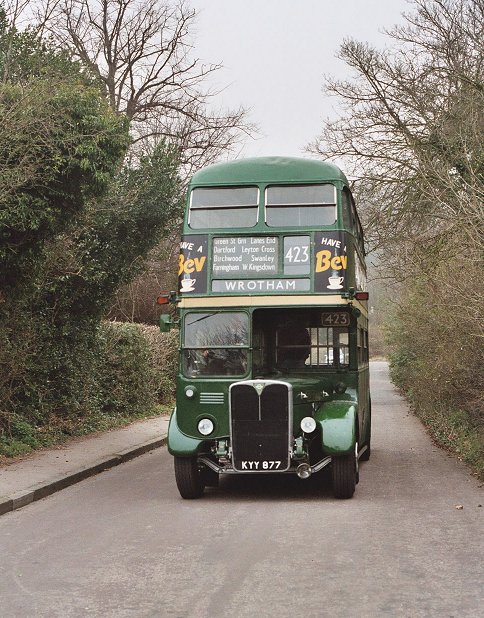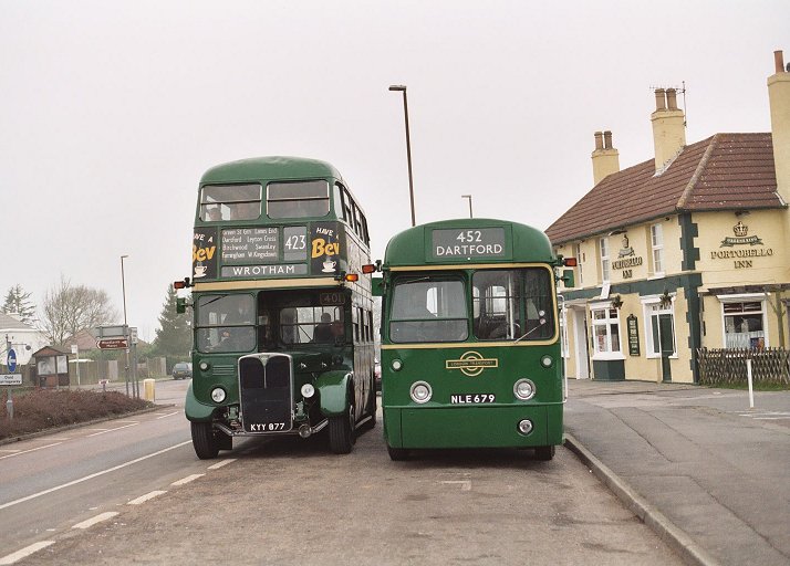 Beyond Fawkham Green the valley continued, only to be interrupted by the giant embankment of the M20. The modern road goes through it in a tunnel, then turns left to run between the motorway and a wood, still climbing up to reach West Kingsdown, 400 feet higher up than at Longfield. Suddenly we were there, at the southern end of West Kingsdown. Mike pulled out onto the old A20, and promptly pulled off it into the bus lay-by by the Portobello Inn, the old terminus of the 452. We were rather late, so where was our connection? According to the timetable there should be an RT coming up from Wrotham any minute. But some work with a mobile phone elicited the information that the RT was still on its way out to us from Swanley. A little while later it appeared, drawing in past the RF to make the connection.