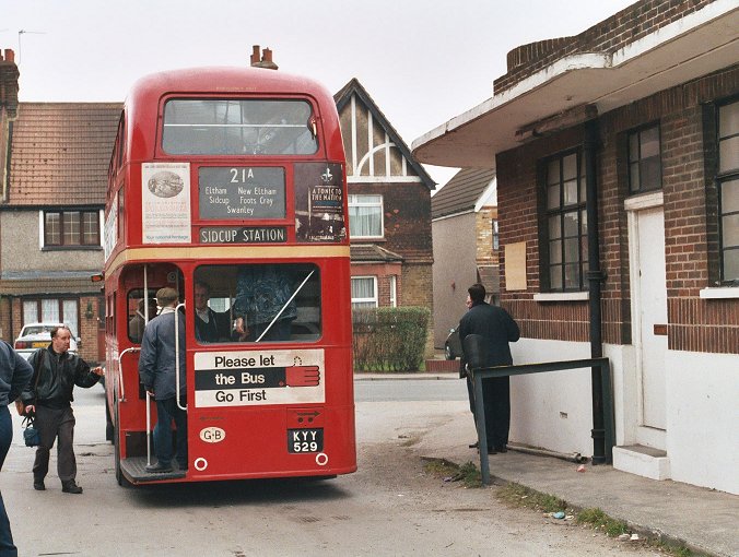 We went down into Swanley proper, then up round the town centre-bypass and on along the old A20. We rubbed shoulders with the modern A20 briefly on the way to Ruxley Corner, where we started to meet other red buses as we dived into Sidcup. We crossed the River Cray, and passed the site of the old Sidcup Garage, then climbed the hill into Sidcup proper. A right turn at the traffic lights took us towards Sidcup Station. Another series of right turns took us into a terminal loop, allowing the bus to stand for a while in a back street not far from the station.