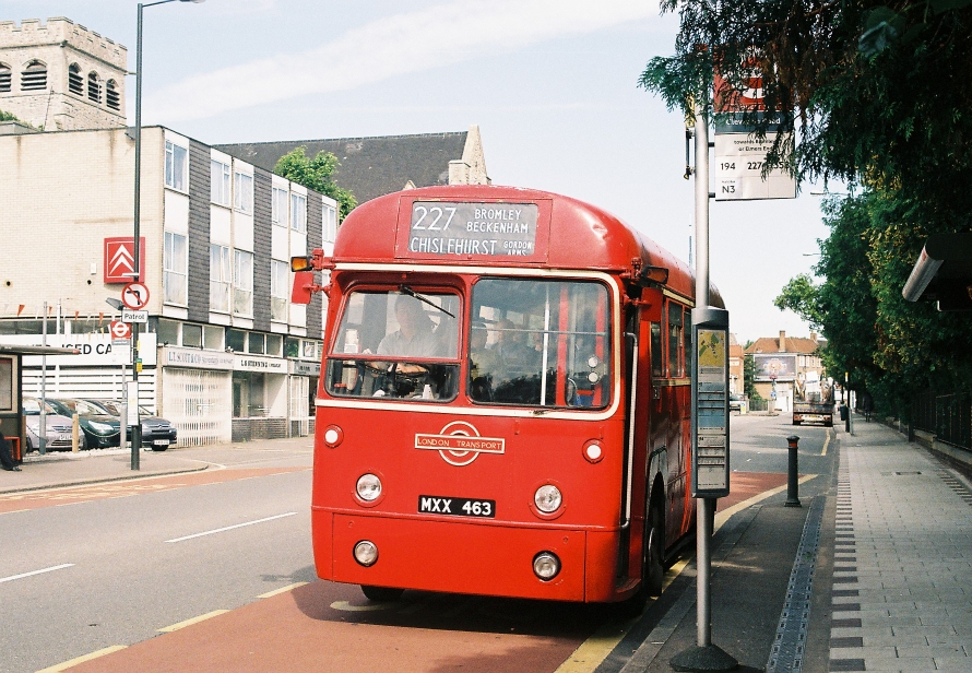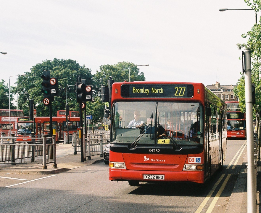 The 227 still runs from Crystal Palace, but nowadays only as far as Bromley North, double-decker 269 having taken over the route eastwards. It is still a very busy route, and uses the longer, 11.3m dual-doorway Darts. 34232 came along to show what I mean. They seat 38 (or 35 now), compared with the RF's 41 in a 9.0m length.