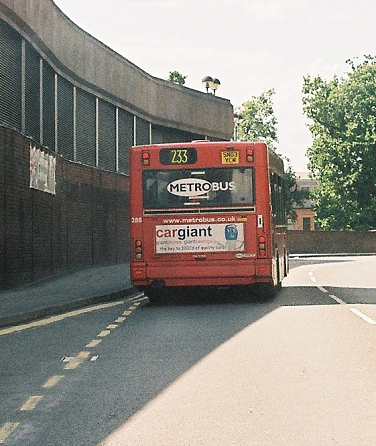 RF429 loaded up opposite Swanley Garage and set off north-westwards, down into the dip and up to Swanley, then right round the perturbation. There we caught up with Metrobus Dart 288 on the 233, which had paused at the Asda stop. A little further on we passed T1030, buzzing southwards on a 21 in a previous incarnation of all-red livery.